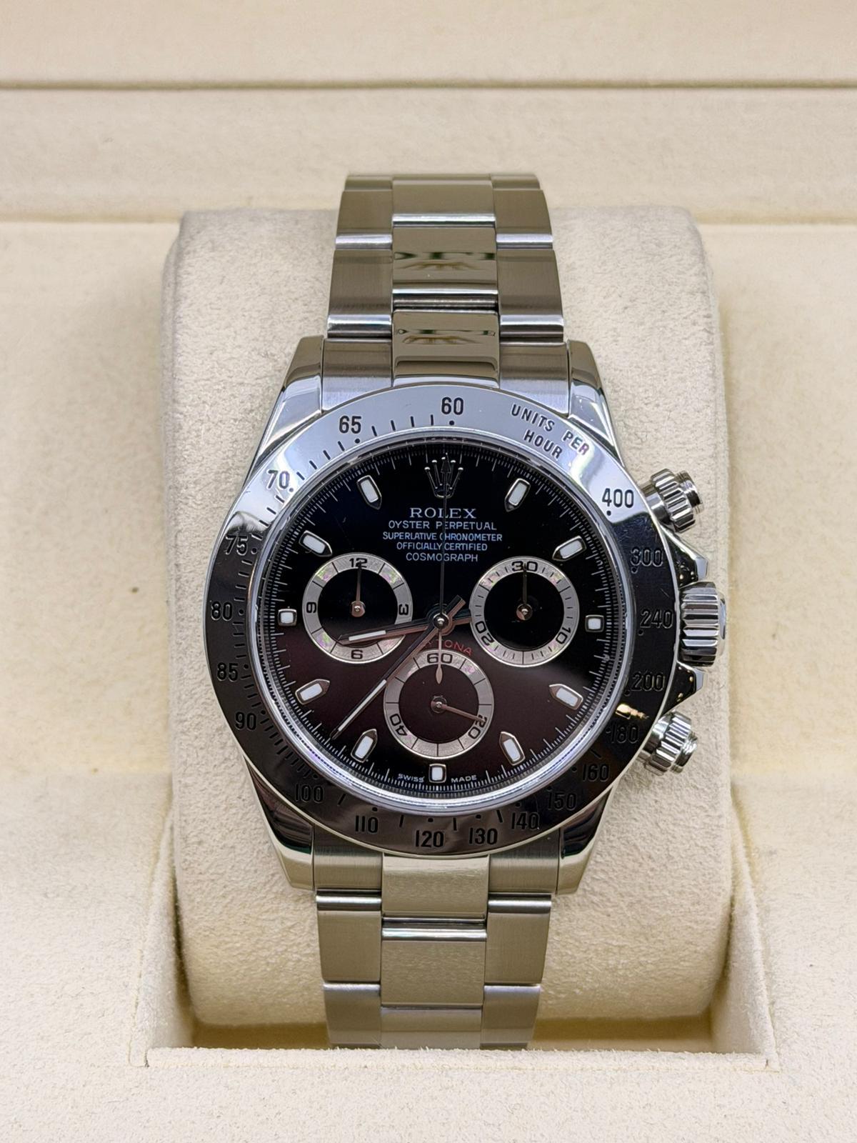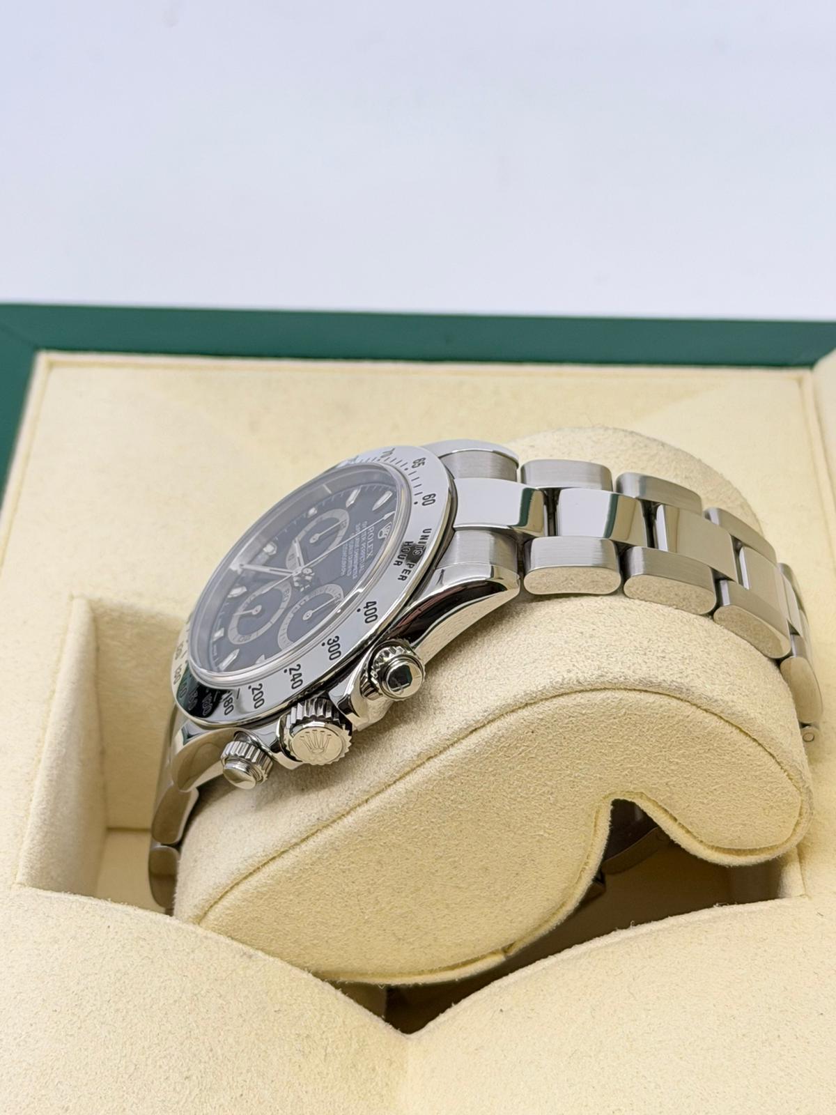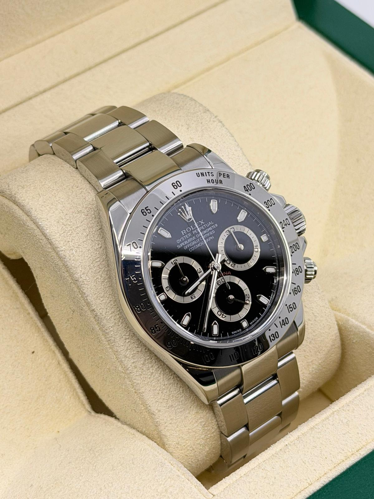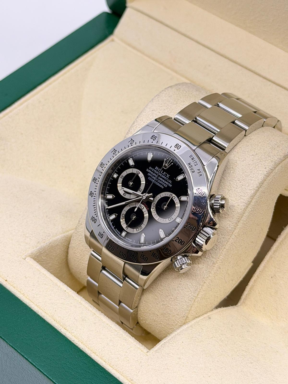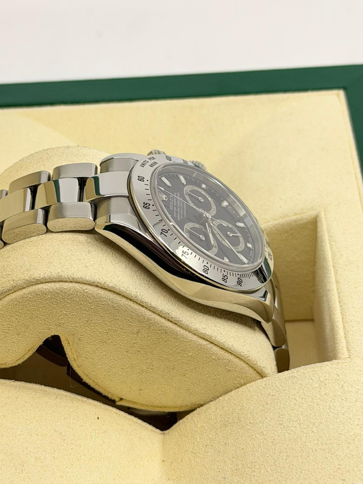 Marca Rolex Modello (Orologio) Daytona Numero di referenza 116520 Carica Automatico Materiale della cassa Acciaio Materiale cinturino Acciaio Anno di produzione 2003 anno approssimativo documenti originali Rolex, no box Carica Automatico Cassa Materiale della cassa Acciaio Diametro 40 mm Impermeabile 10 ATM Materiale lunetta Acciaio Vetro Vetro zaffiro Quadrante Nero Materiale cinturino Acciaio Colore cinturino Acciaio Chiusura Déployante Materiale chiusura Acciaio