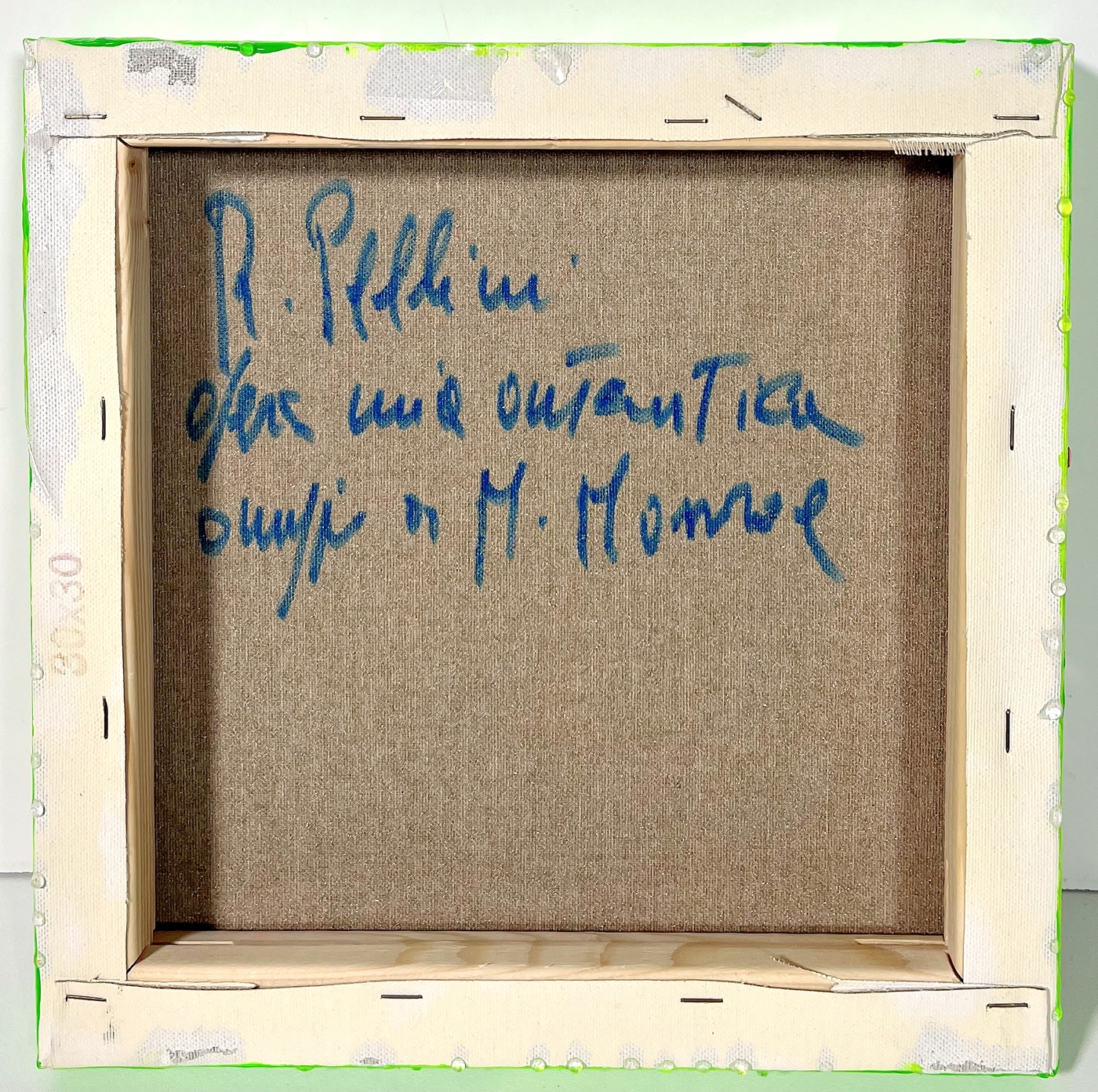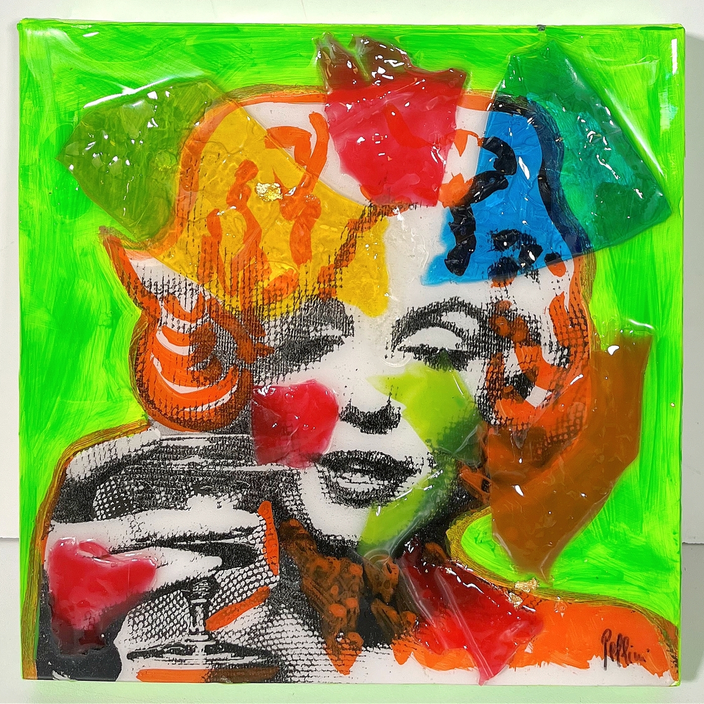 ROLANDO PELLINI, 30 X 30 cm, ”Omaggio a M. Monroe", Tecnica mista e resine su tela ,autentica dell'artista su fotografia