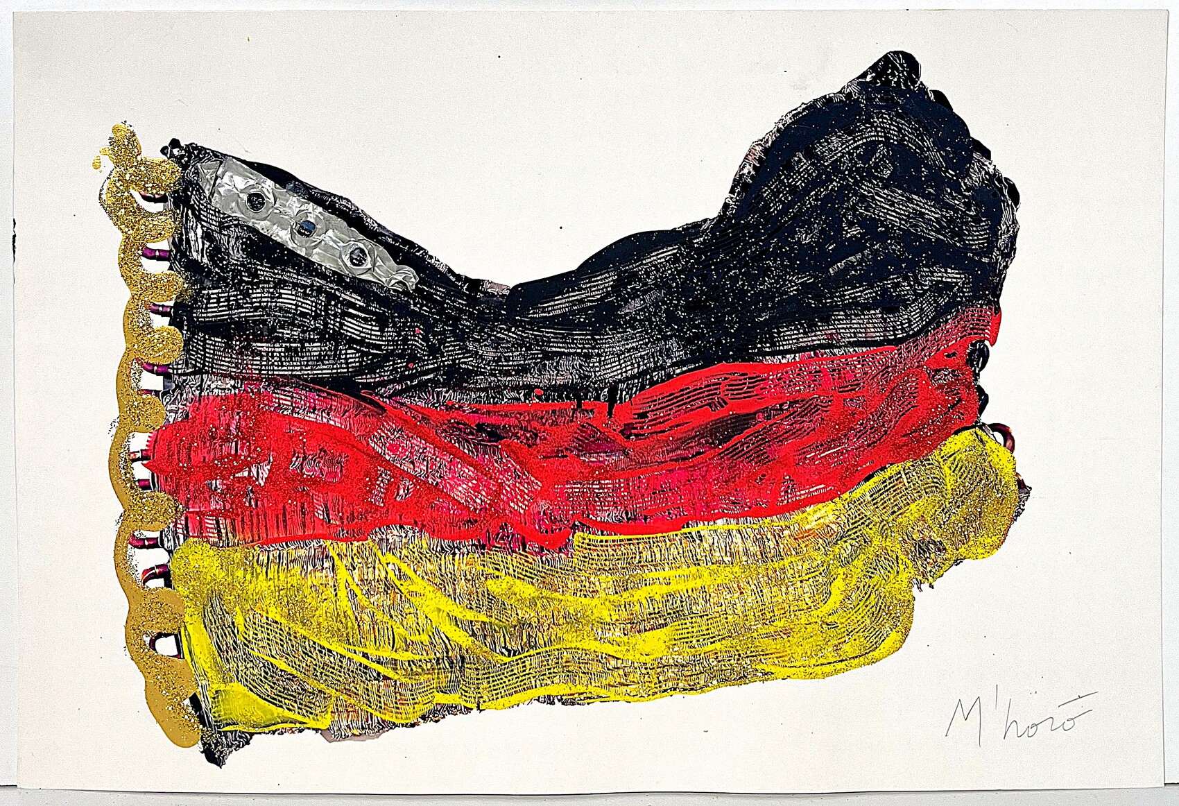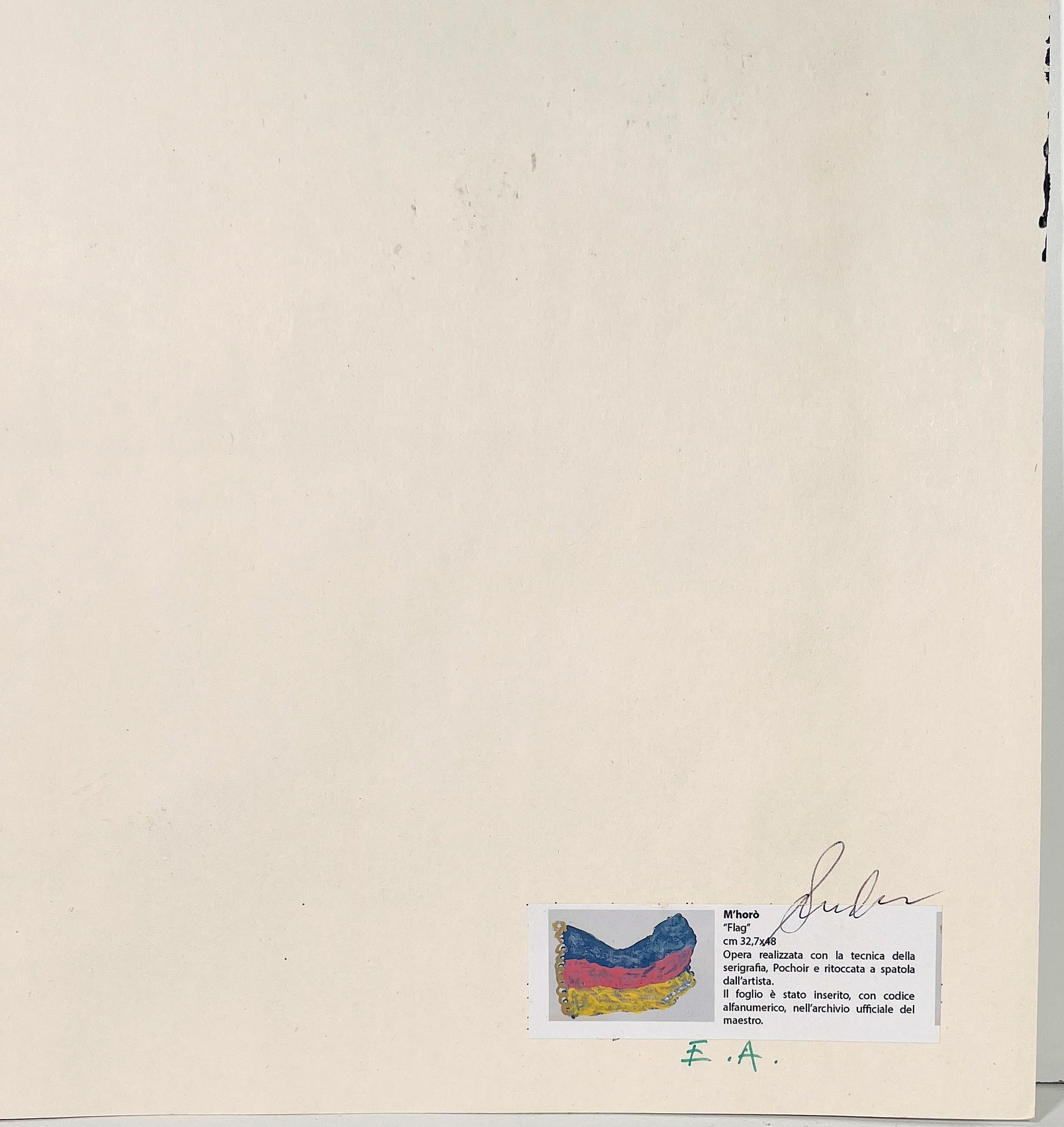M’HORO’, 33 X 48,5 cm, ”Flag” serigrafia, acrilico e tecnica mista e collage su cartoncino, esemplare E.A., firma in basso a destra, tiratura al retro