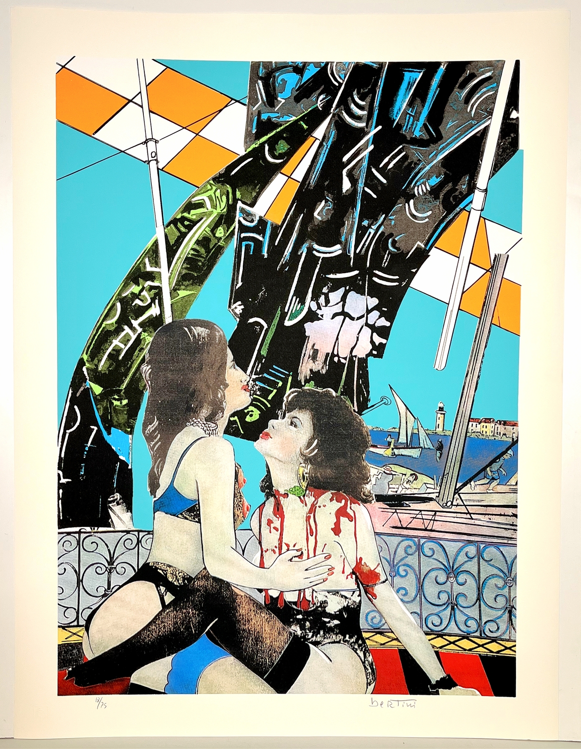 GIANNI BERTINI, 105 X 79,5 cm, Le bambole n.3Serigrafie stampate a 8 colori su carta uso mano da 300g. delle cartiere Fedrigoni.Anno 2002Tiratura: 100 esemplari numerati e firmati dall’artistaFirma in basso a destra numerazione in basso a sinistraTimbro a secco della "Prearo Editore" in basso a sinistra