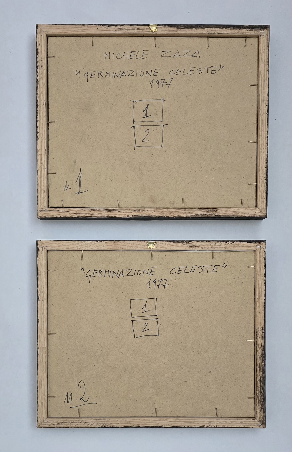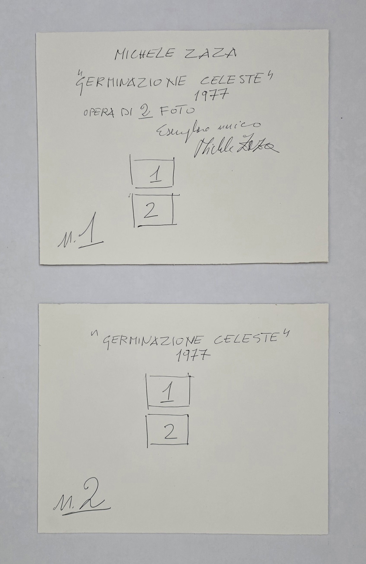 MICHELE ZAZA, due foto 24 x 30 cm cadauna, ( 48 x 60 cm ), “ germinazione celeste 1977” , due fotografie a colori riportate su pannello, firma titolo e anno al retro nella prima foto, titolo e anno sul secondo elemento , dichiarazione di autenticità dell’artista su foto.