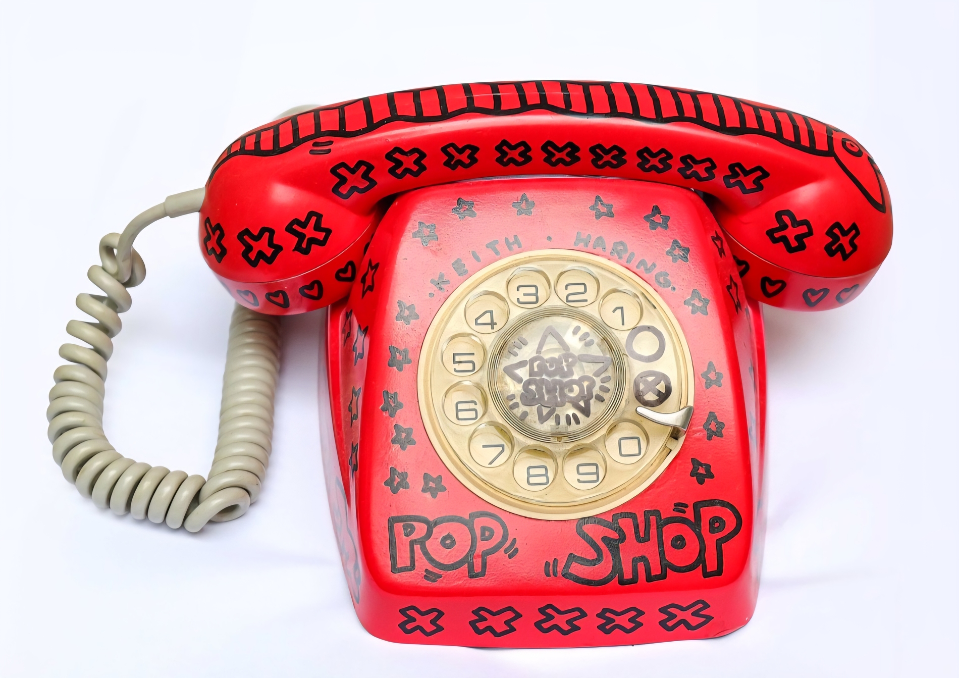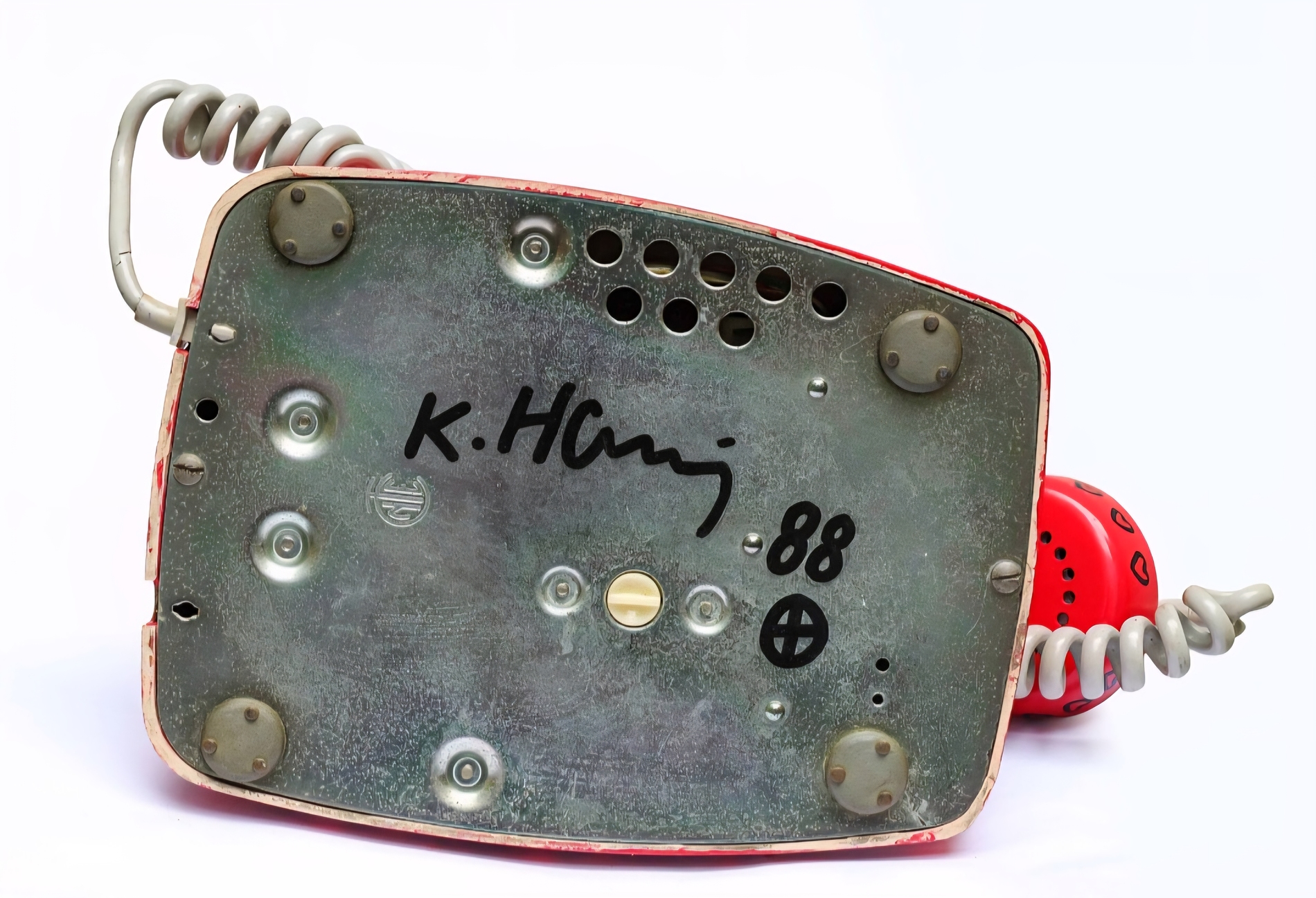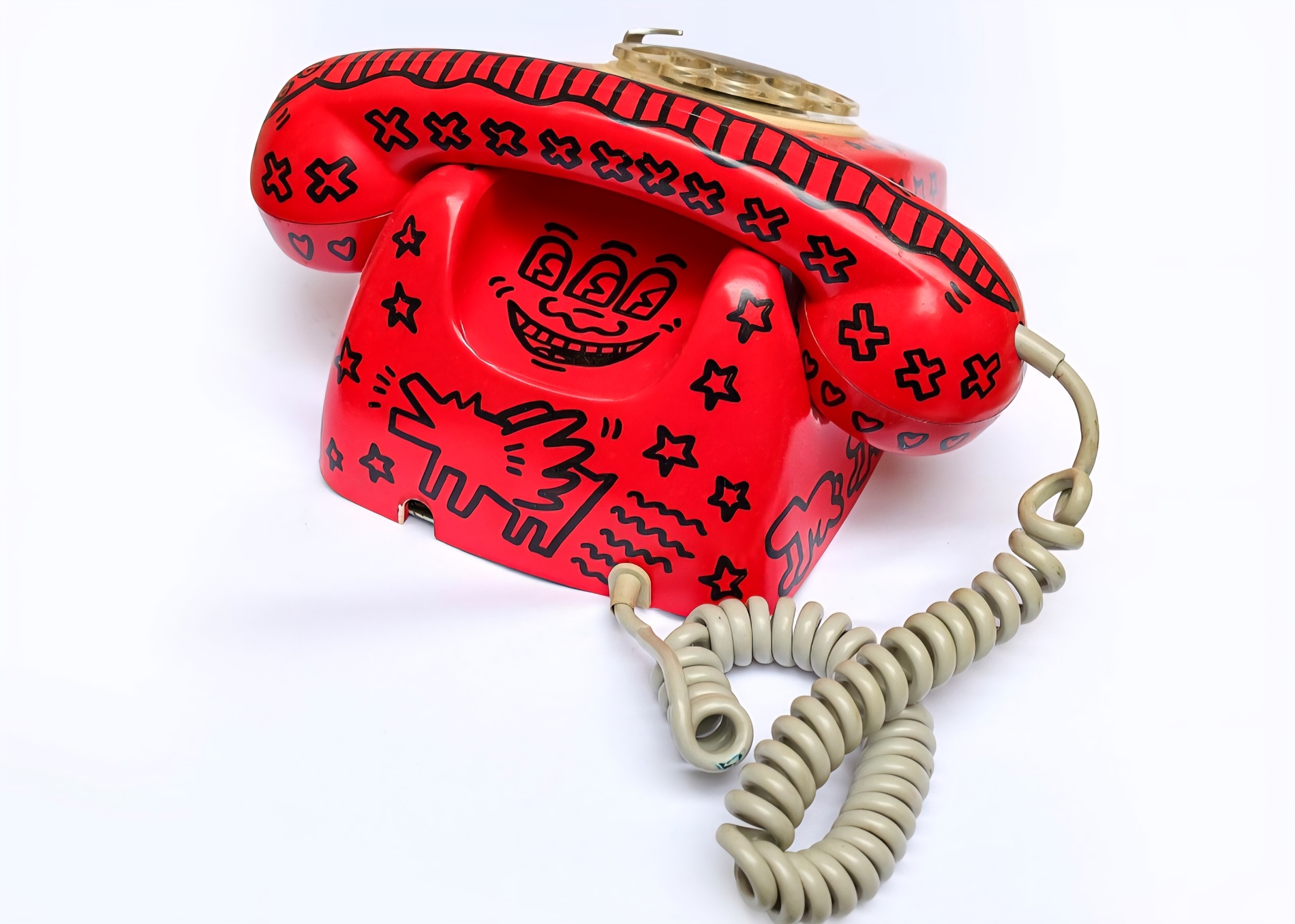 KEITH HARING ( attribuito ), h 11 x 20 x 23 cm, Pop shop telefono del 1988, pennarello nero su telefono rosso, Firma e anno a retro, in allegato certificato di provenienza di nota Casa D’asta.