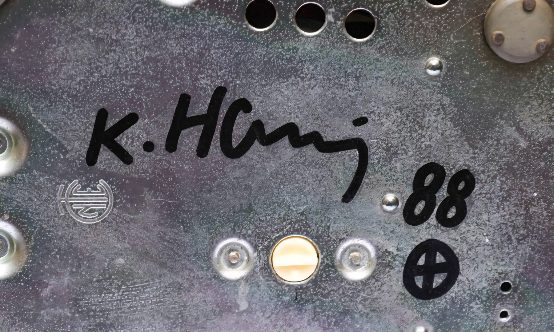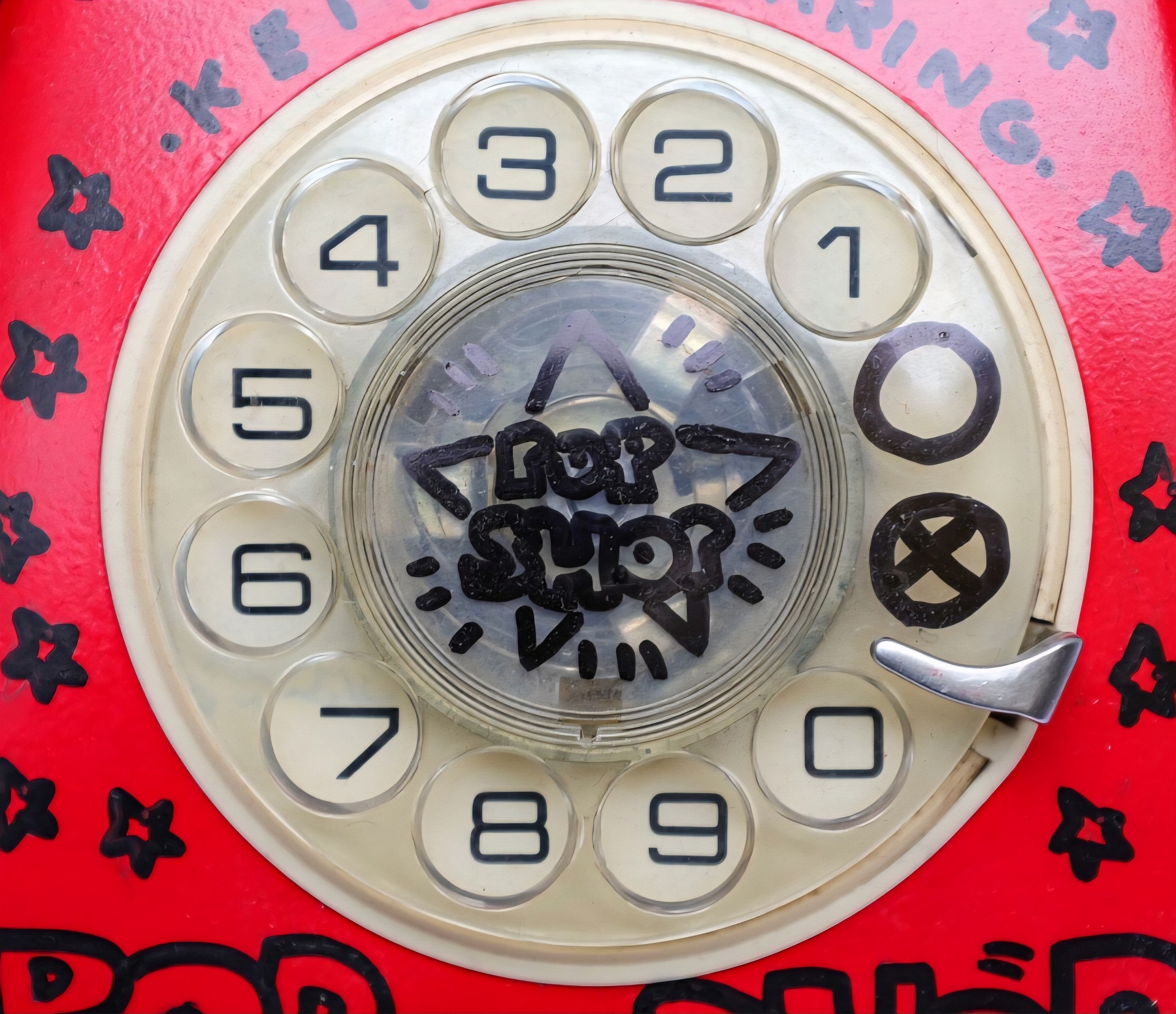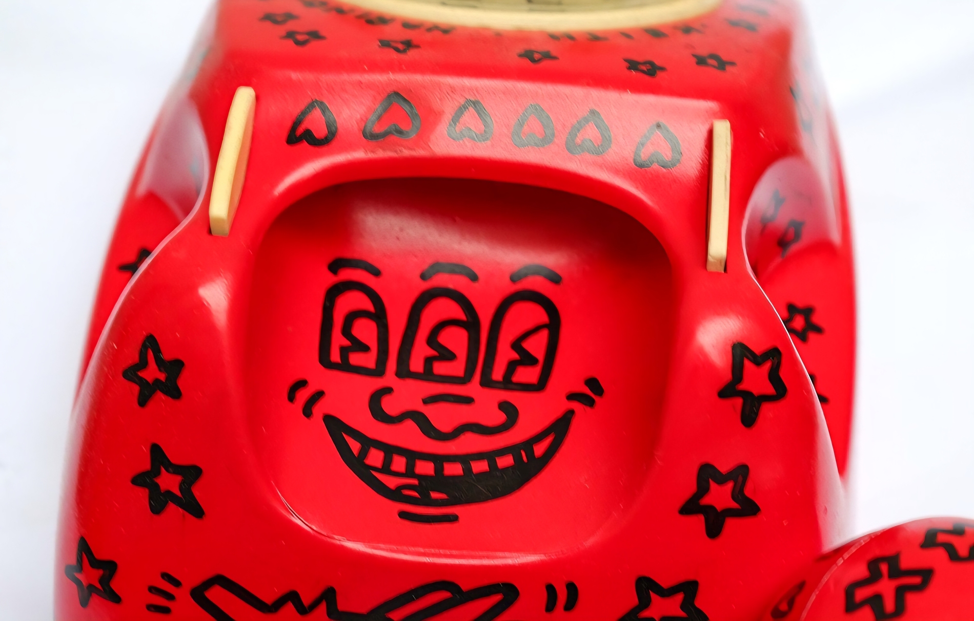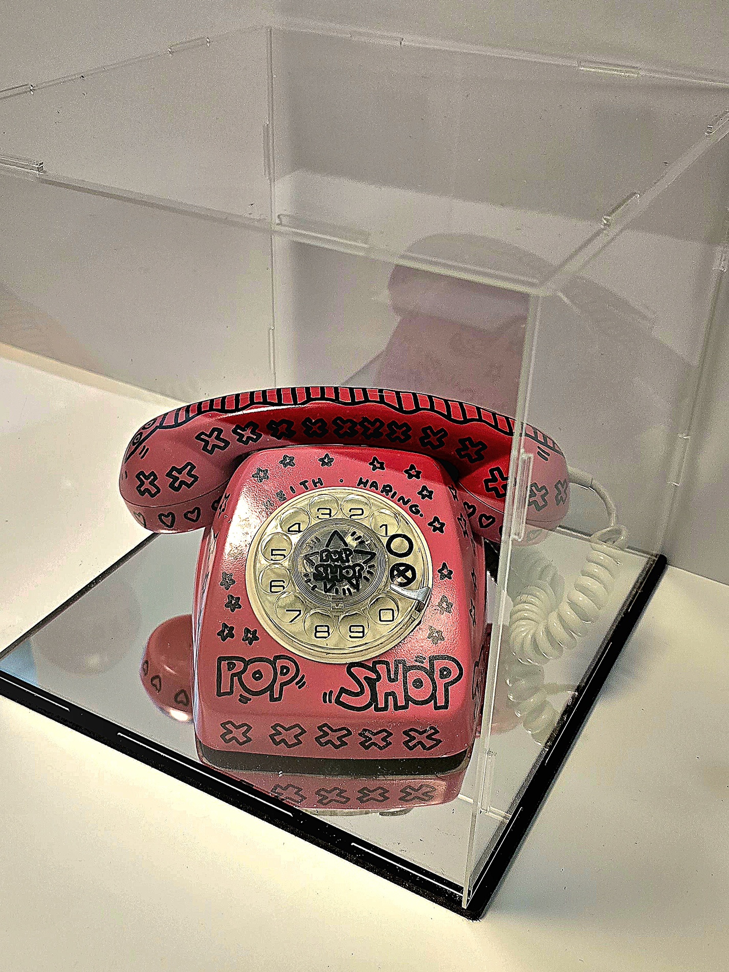 KEITH HARING ( attribuito ), h 11 x 20 x 23 cm, Pop shop telefono del 1988, pennarello nero su telefono rosso, Firma e anno a retro, in allegato certificato di provenienza di nota Casa D’asta.