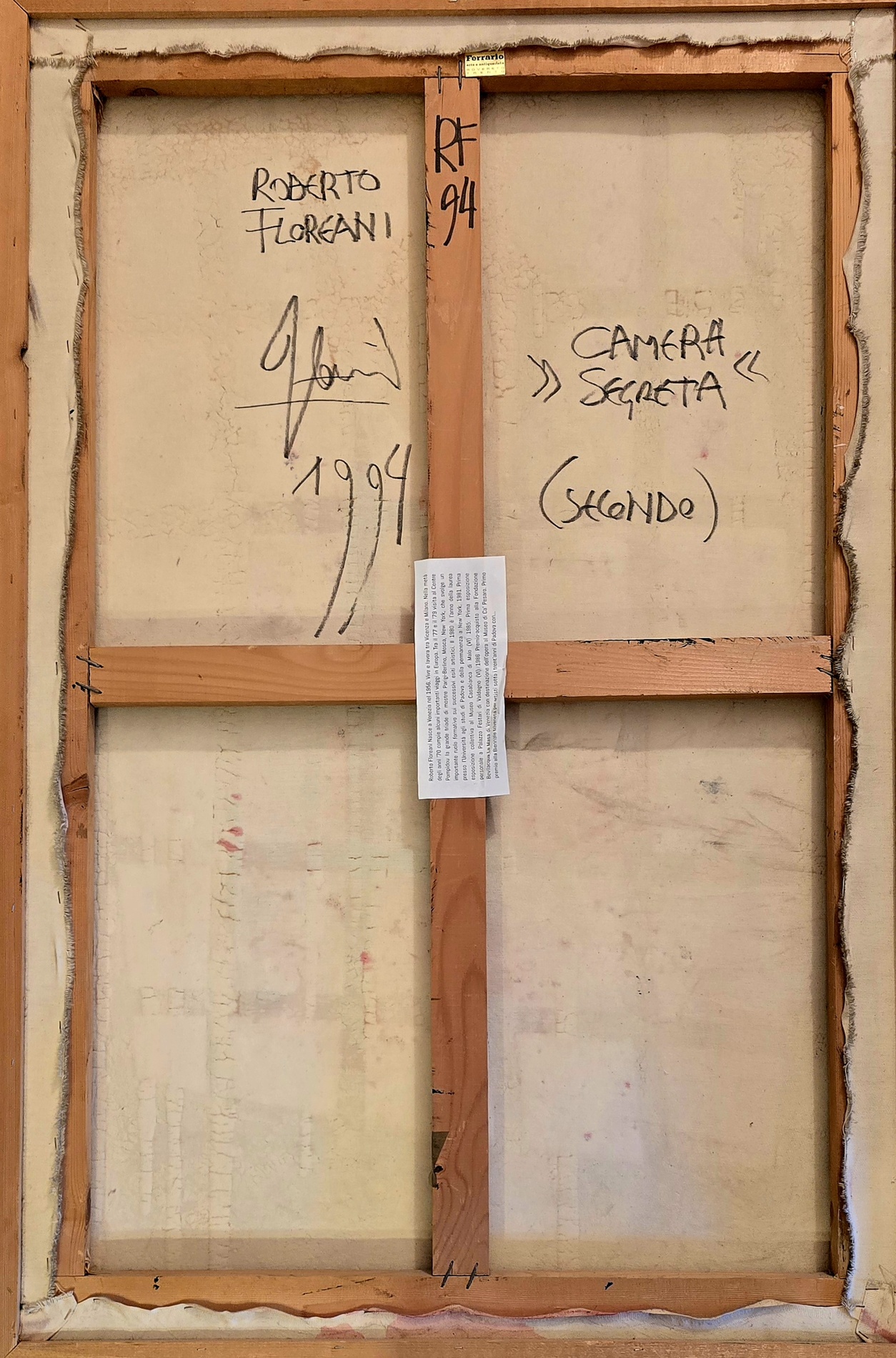 ROBERTO FLOREANI, 120 X 80 cm, olio su tela del 1994, Titolo “ Camera segreta 1994 “, Firma anno e titolo al retro della tela.