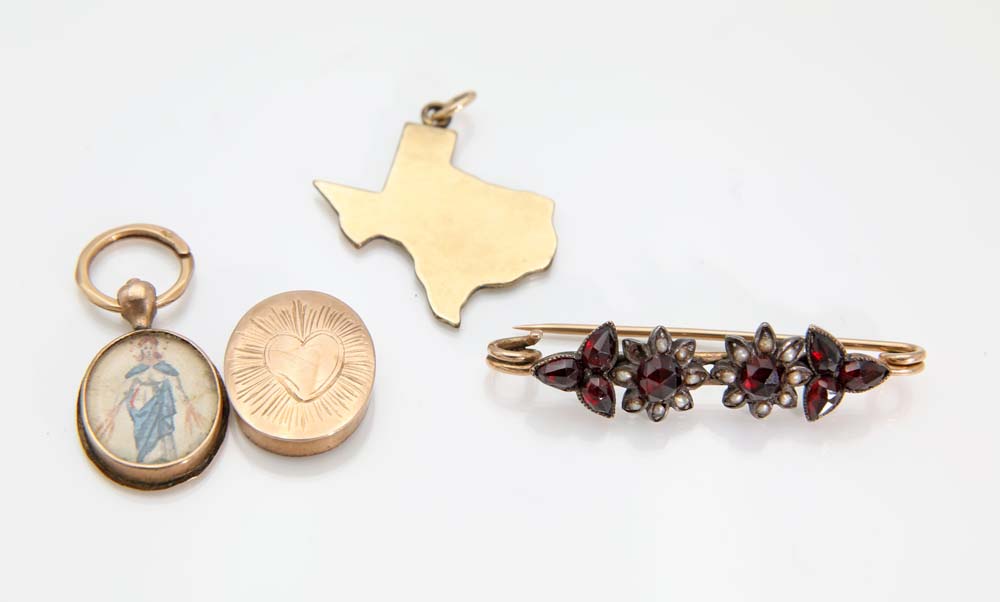 Coppia di pendenti e spilla antica in oro e pietre rosse Oro a basso titolo. Peso complessivo gr. 9