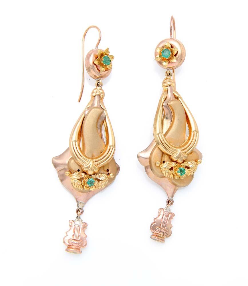 Coppia di orecchini pendenti in oro e smeraldi Oro a basso titolo. Peso complessivo gr. 10,1 Lunghezza cm 7