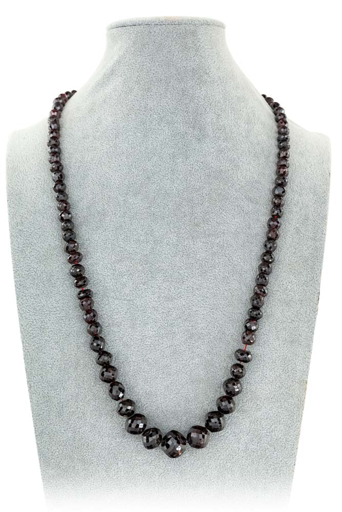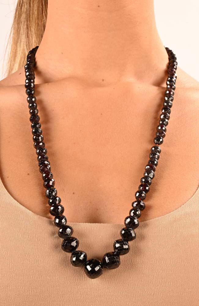 Collana ad un filo in oro e granati. Oro a basso titolo. Granati in taglio briolette da mm. 7 a mm. 17. Peso complessivo gr. 139 Lunghezza cm 70