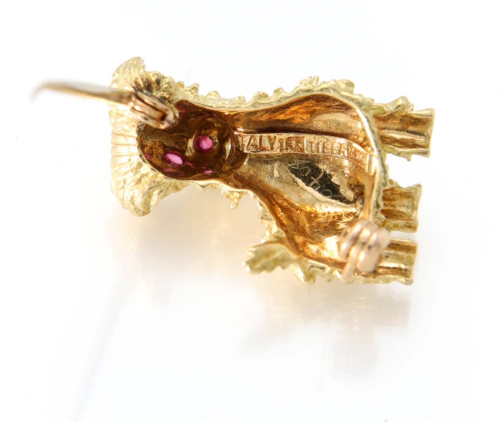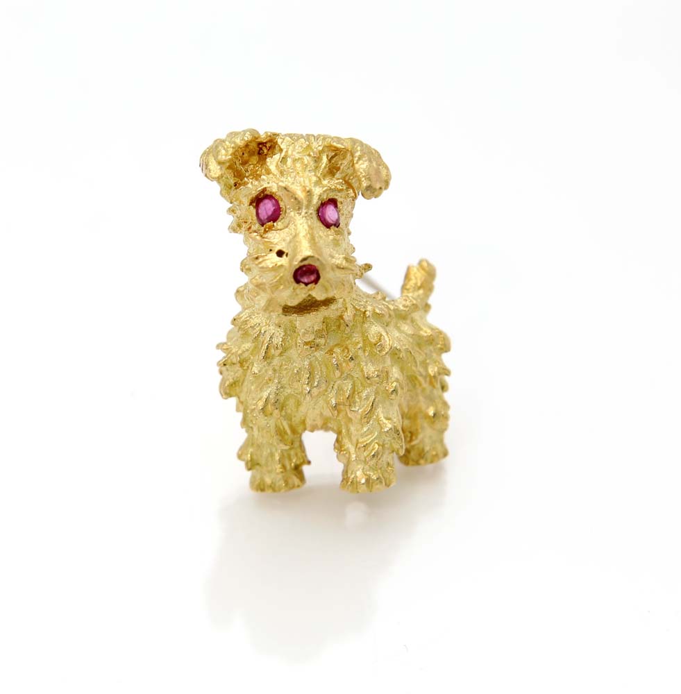 Tiffany, spilla terrier in oro e rubini Oro giallo 750/000. Peso complessivo gr. 6,30. cm 2,5 x 1,5