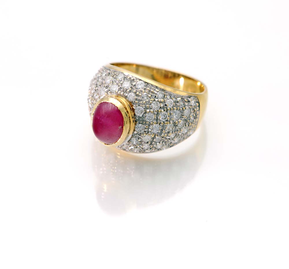Anello a fascia in oro, rubino e brillanti Oro giallo e bianco 750/000. Rubino centrale in taglio cabochon e diamanti in taglio rotondo. Peso complessivo gr. 9 Misura 17