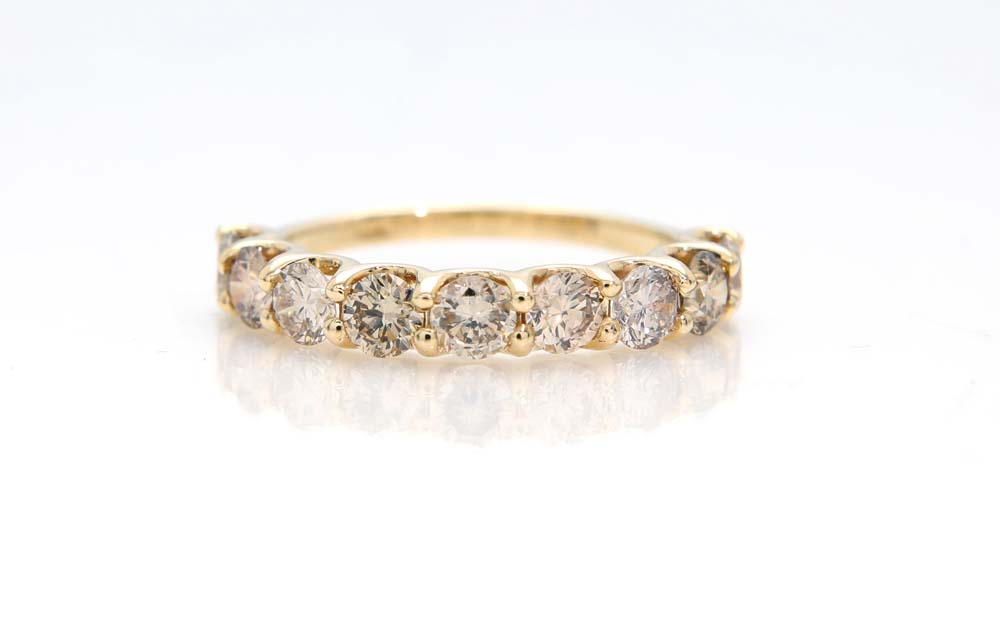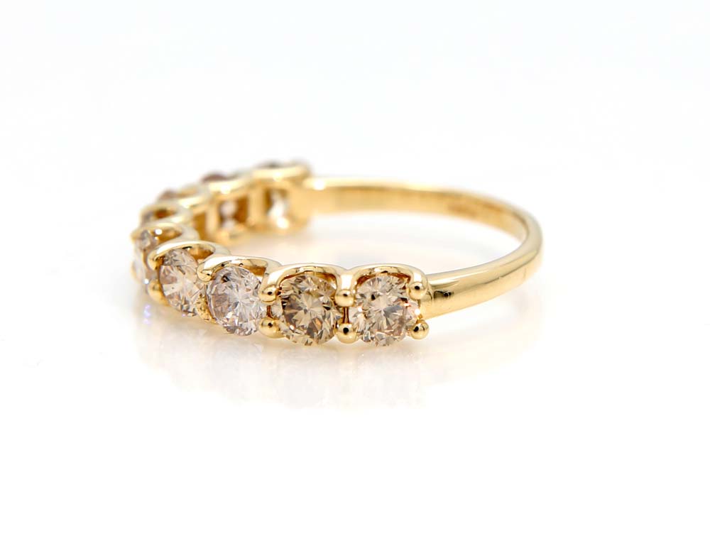 Anello a riviera in oro e brillanti Oro giallo 585/000. Diamanti in taglio rotondo brillante fancy brown ct. 1,69. Peso complessivo gr. 2,50. corredato di certificazione gemmologica IGI n° 62J5752825 del 08/12/2025. Misura 14