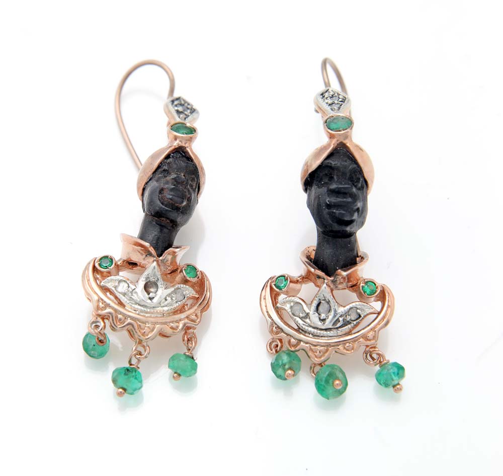 Coppia di orecchini moretti in oro, argento, diamanti, smeraldi ed ebano. Oro a basso titolo e argento.  Lunghezza cm 4,5.