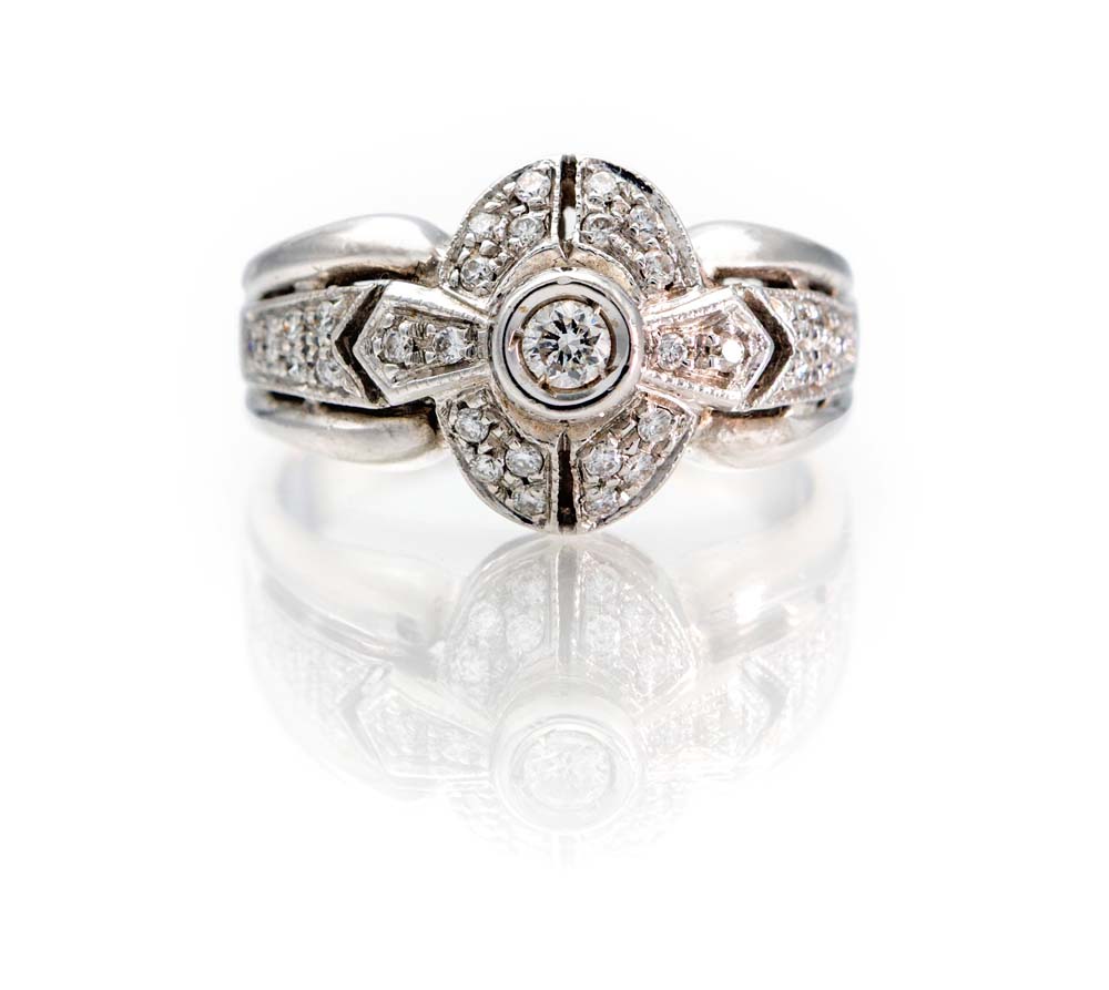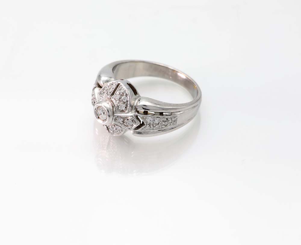 Anello in oro e brillanti Oro bianco 750/000. Diamanti in taglio rotondo brillante. Peso complessivo gr. 7. Misura 13