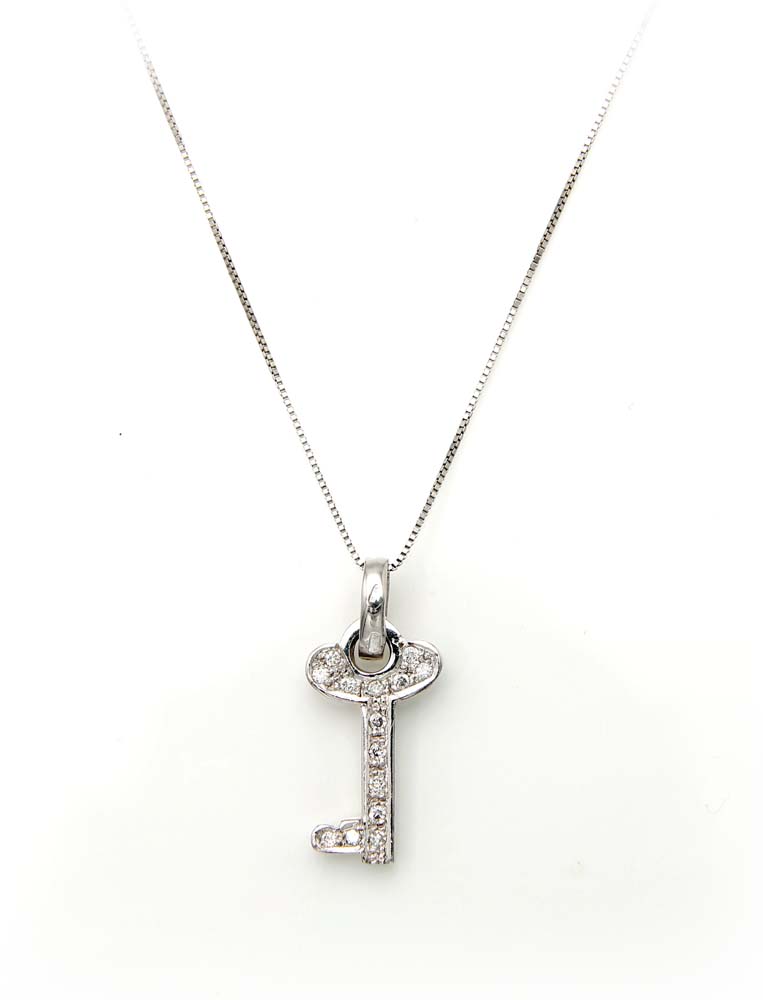 Pendente a chiave in oro e brillanti Oro bianco 750/000. Peso complessivo gr. 3,60 Lunghezza cm 42