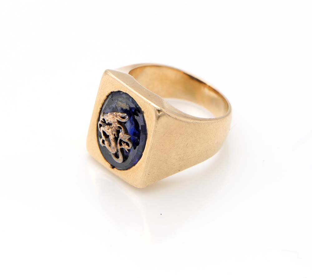 Anello a sigillo in oro e pietra blu Oro giallo 750/000. Peso complessivo gr. 12,50 Misura 7