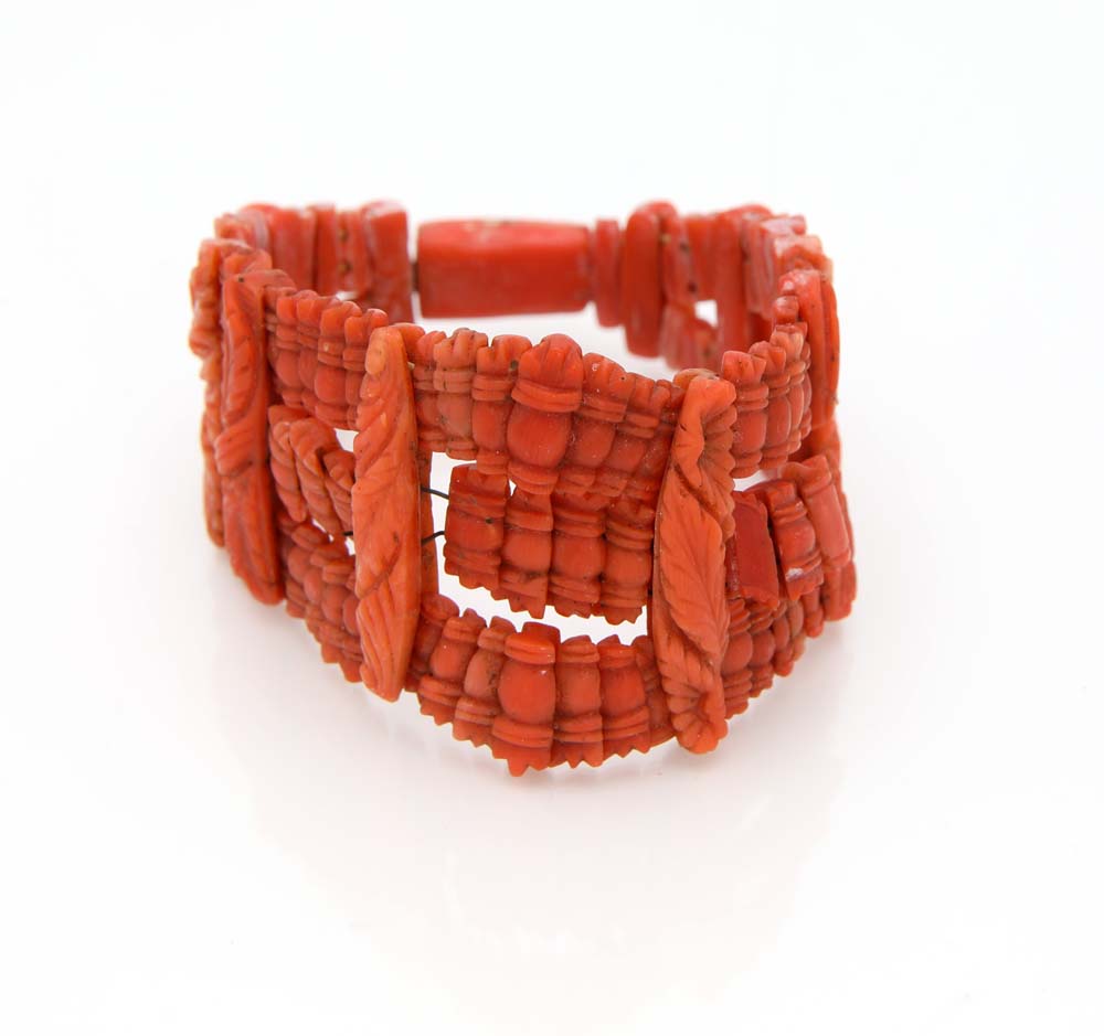 Bracciale antico in corallo e argento Argento 800/000. Difetti. Lunghezza cm 17, altezza massima cm 4,5