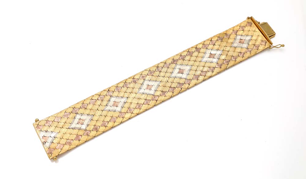 Bracciale in oro, lavorazione a nido d'ape. Oro giallo 750/000. Peso complessivo gr. 76,50. Lunghezza cm 19, altezza cm 3.