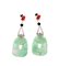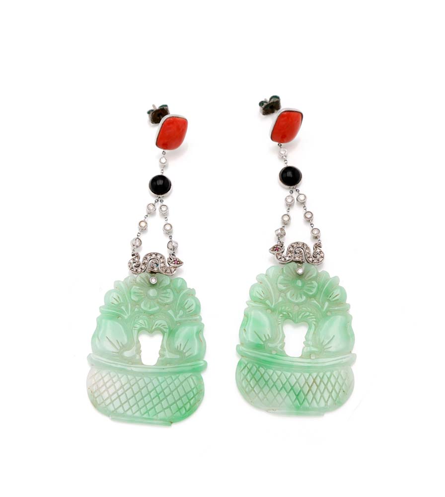 Coppia di orecchini pendenti in oro, giade, corallo, onice e brillanti Oro bianco 750/000. Lunghezza cm 9