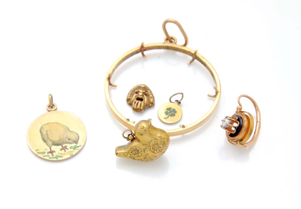 Lotto di 6 oggetti in oro e smalti Oro giallo 750/000. Peso complessivo gr. 20,70