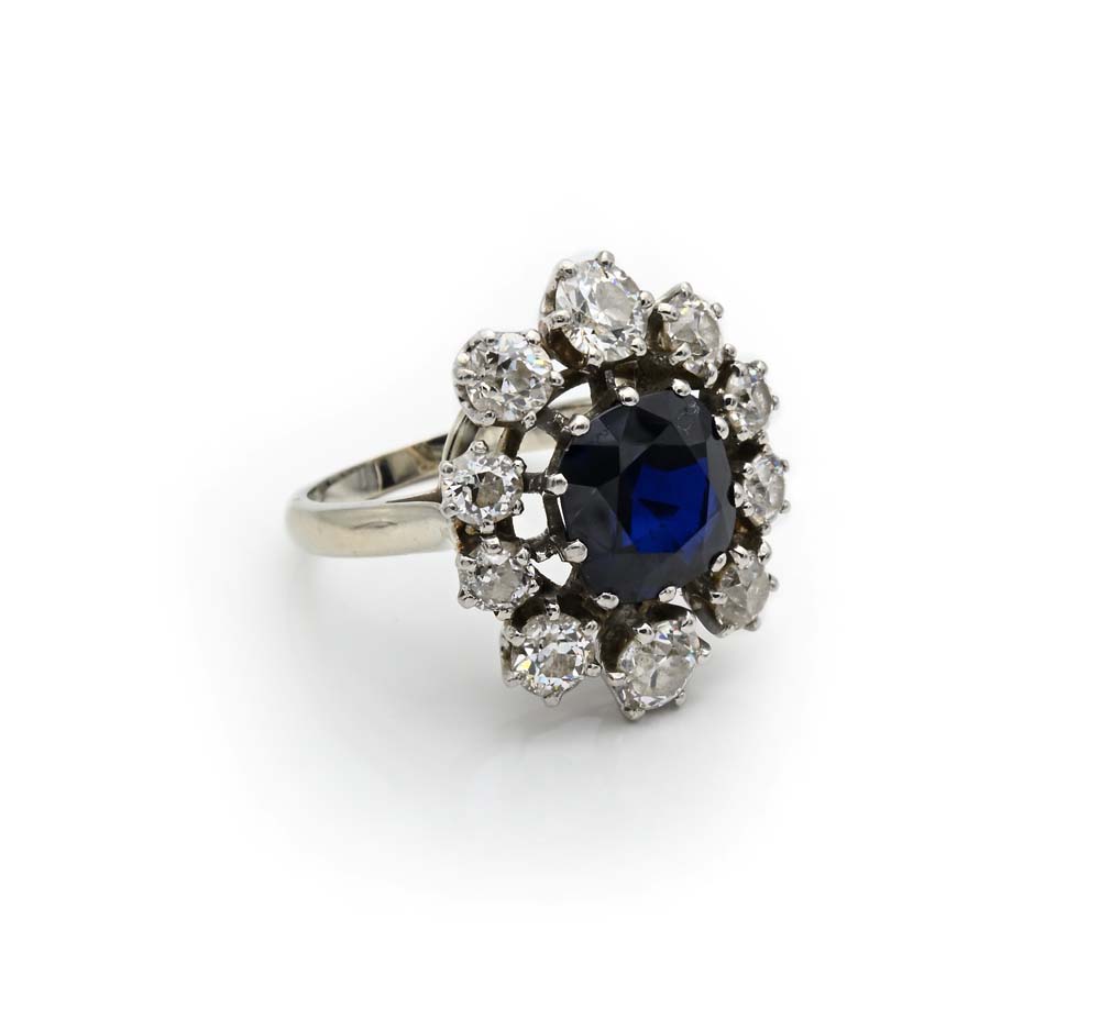 Lotto 108 | Anello in oro, zaffiro e brillanti Oro bianco 750/000. Peso complessivo gr....