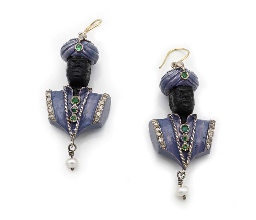 Coppia di orecchini moretti in oro, argento, smalti Oro a basso titolo,...