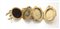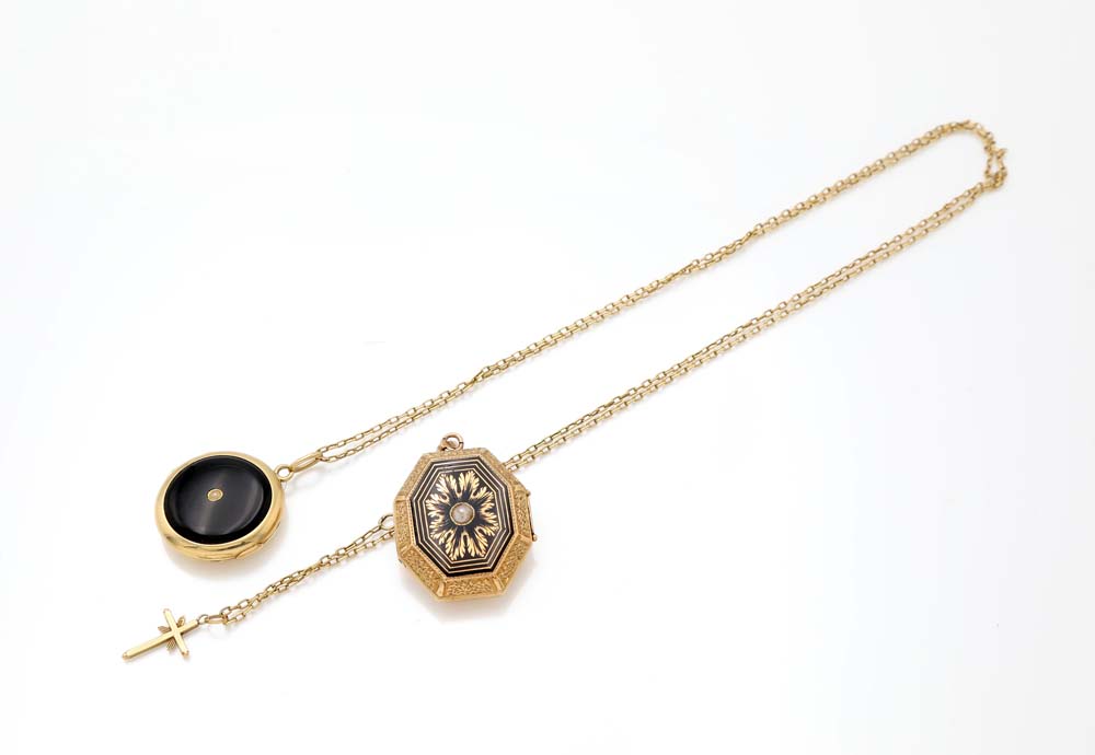 Coppia di portafoto con catena in oro e smalti Oro giallo 750/000. Portafoto con vetro di protezione. Peso complessivo gr. 28,70