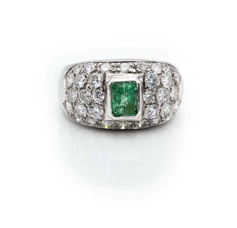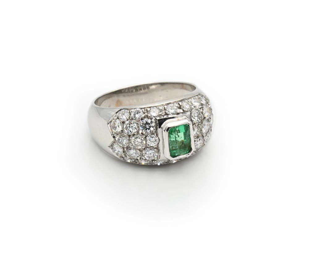 Anello a fascia in oro, smeraldo e diamanti. Oro bianco 750/000. Diamanti ct. 1,70 ca. Peso complessivo gr. 9,20 Misura 15