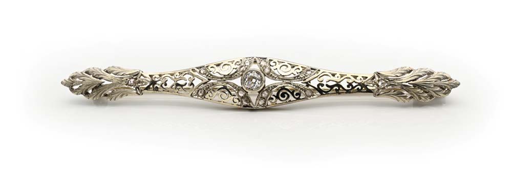 Spilla a barretta in oro e diamanti Oro bianco 750/000. Peso complessivo gr. 6,30 Lunghezza cm 7