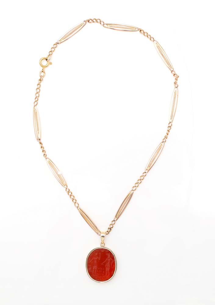 Catena antica con pendente in corniola ad intaglio Oro giallo 750/000 e 585/000. Peso complessivo gr. 20,50