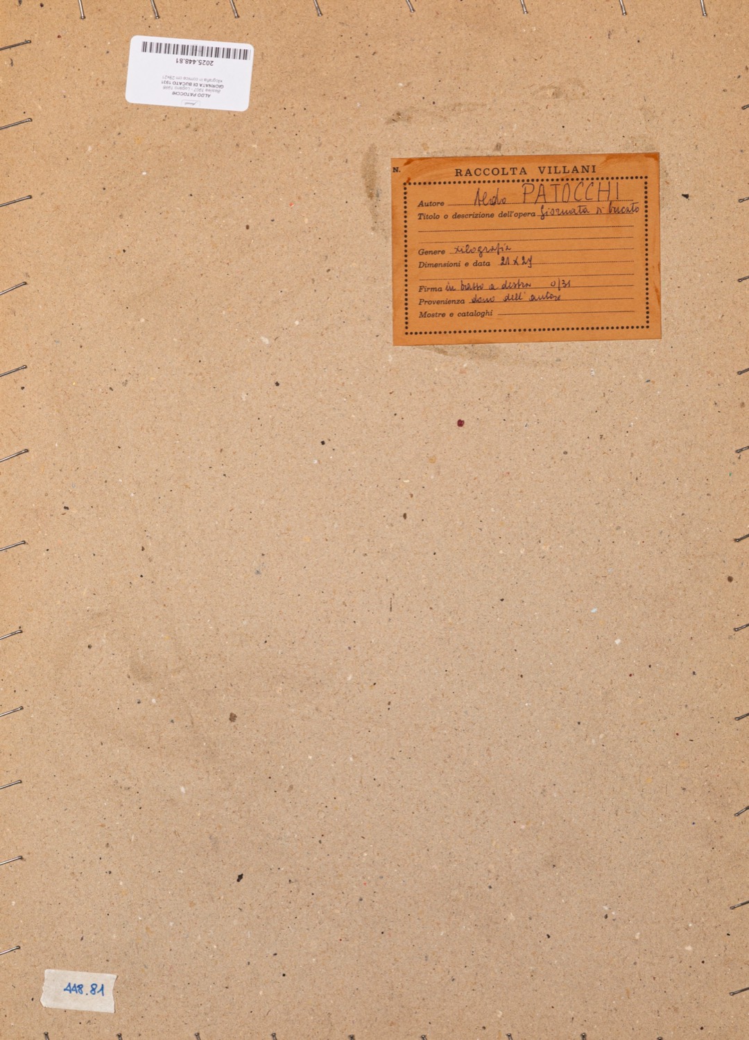 Provenienza: "Raccolta Villani" etichetta al retro con dettagli dell'opera.