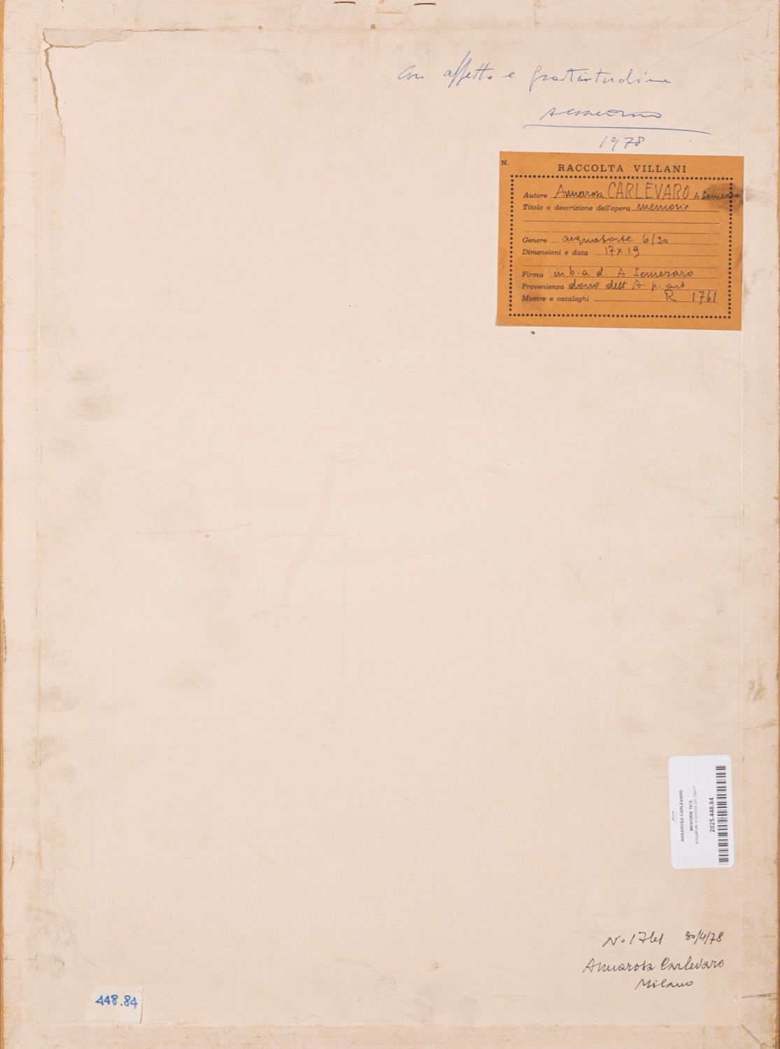 Provenienza: "Raccolta Villani" etichetta al retro con dettagli dell'opera.