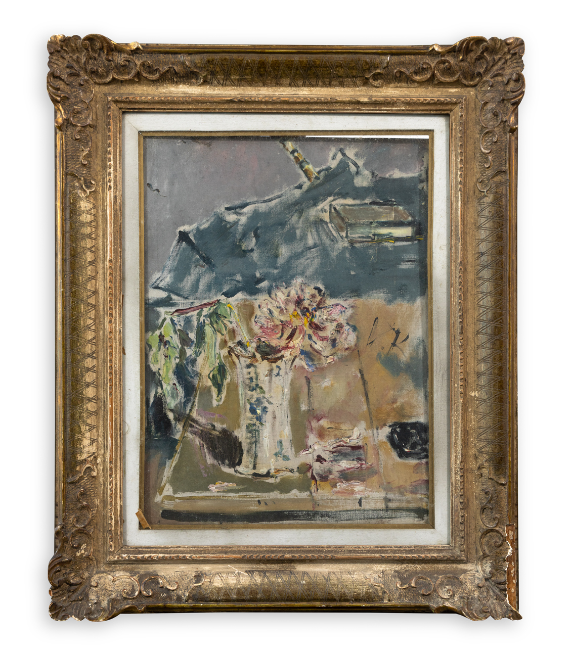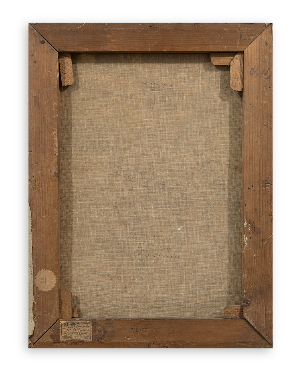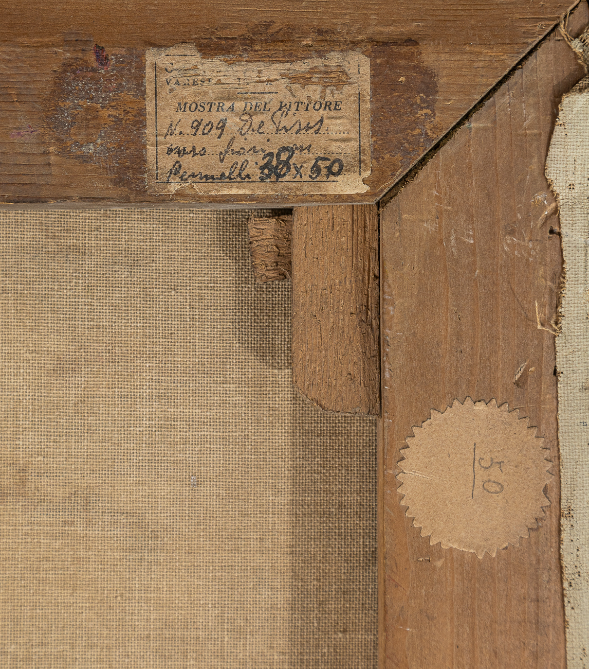 Ulteriore etichetta parzialmente abrasa al retro recante seguente iscrizione ‘Mostra del pittore – N.909 De Pisis - Vaso di fiori con pennelli 38x50’