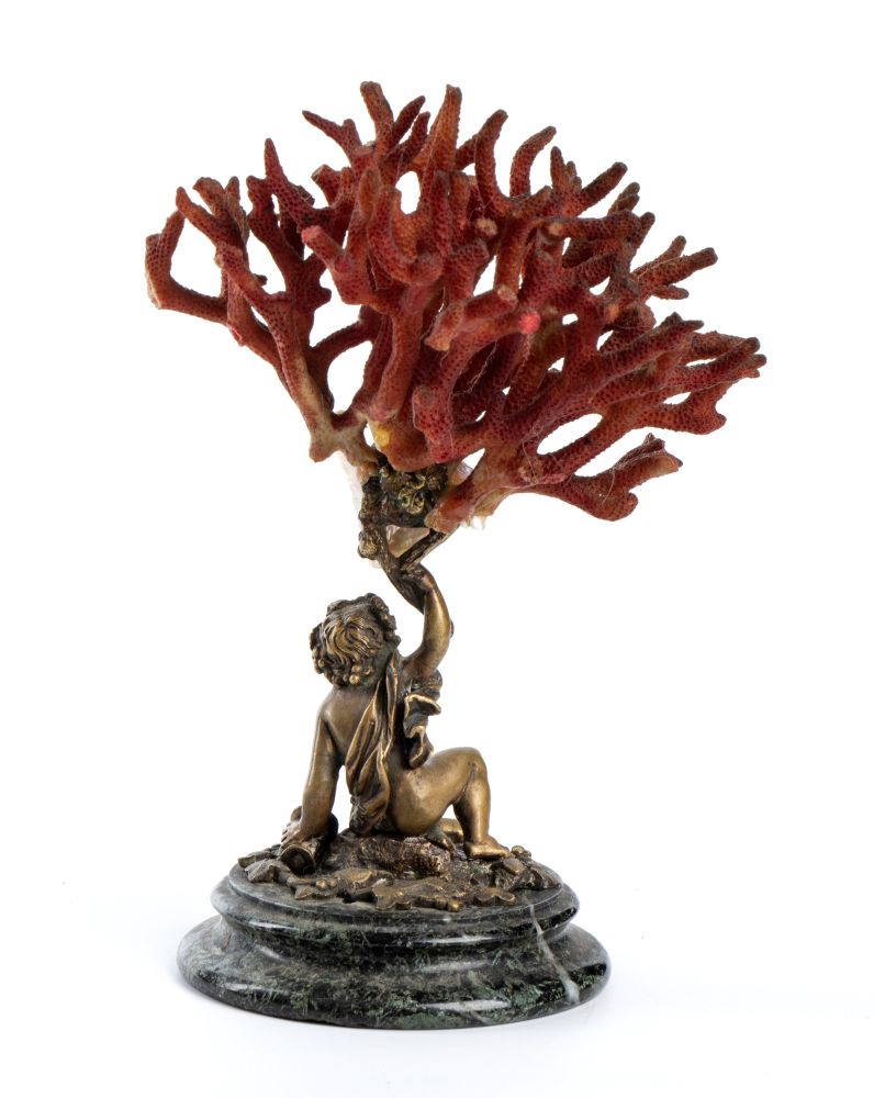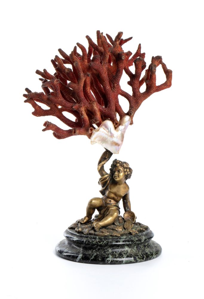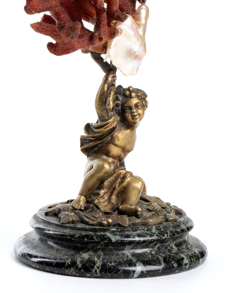 formata da a una base in marmo verde scuro di forma circolare che funge da sostegno a un putto in bronzo dorato modellato. La figura, seduta con una gamba piegata e l’altra distesa, volge il capo lievemente verso l’alto; il braccio destro è sollevato a reggere un ramo di corallo rosso del Mediterraneo (Corallium Rubrum) sul quale è montata una perla barocca di grandi dimensioni, utilizzata come elemento di raccordo tra il putto e il corallo.