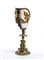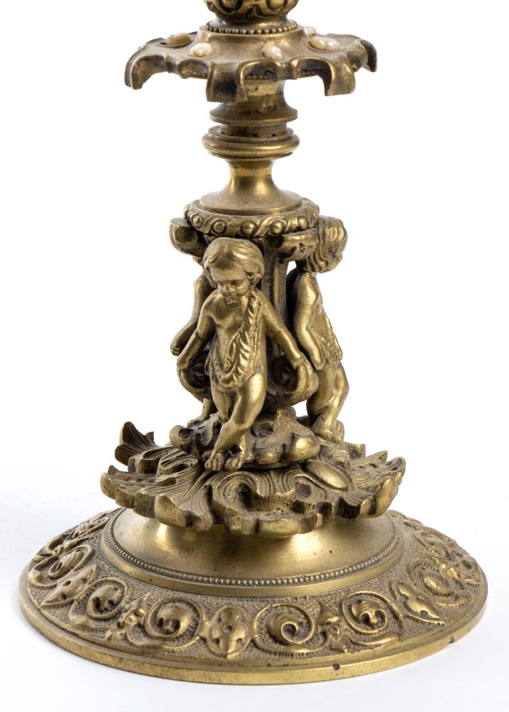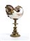 montata su una base in ottone di forma circolare ornata da una fascia decorata a motivi vegetali e regge un fusto cesellato, arricchito da piccole figure di putti poggianti su un basamento a volute. Il corpo della conchiglia è incastonato in una montatura decorativa in ottone con applicazioni fitomorfe e rocaille, impreziosite da pietre dure di ametiste alcune cabochon di dimensioni maggiori incastonate. Sulla parte frontale sono applicate le figure di cherubini alati, rappresentati nell’atto di suonare una tromba, simbolo di trionfo o annuncio, elemento decorativo tipico del gusto neobarocco e neorinascimentale. Un sottile bordo in ametiste incornicia la linea superiore della conchiglia.