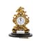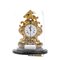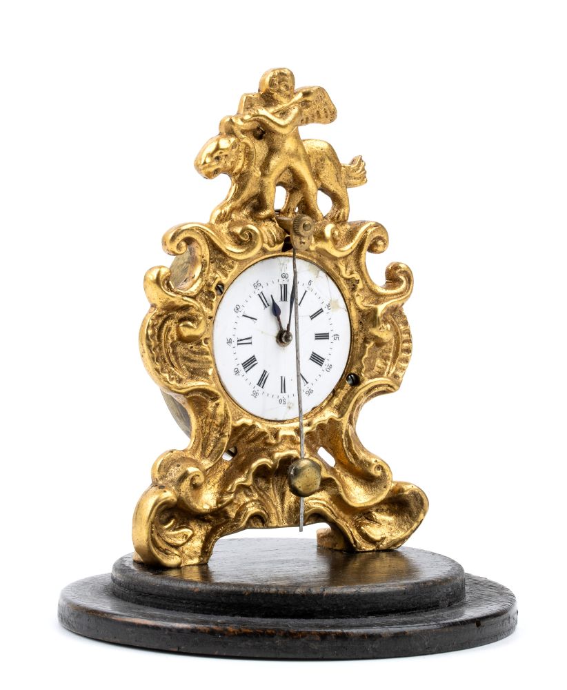 Cassa sagomata in bronzo dorato cimato da un putto musicante ed una tigre, quadrante in smalto bianco con numeri romani e sfere neri, lungo pendolo che parte dalla sommità e carica a chiave