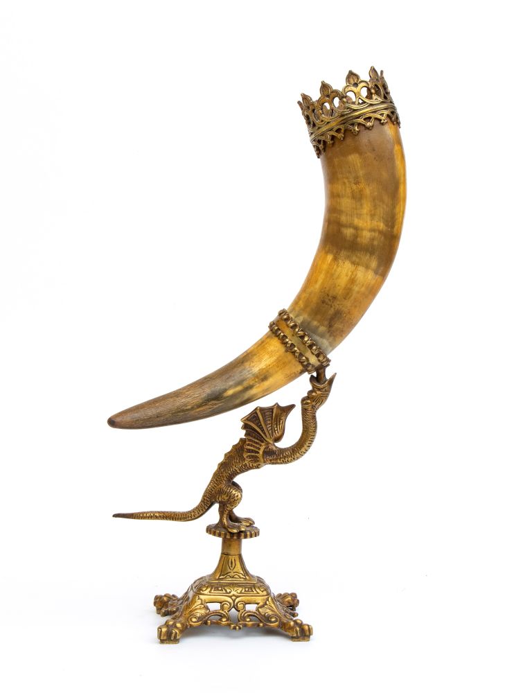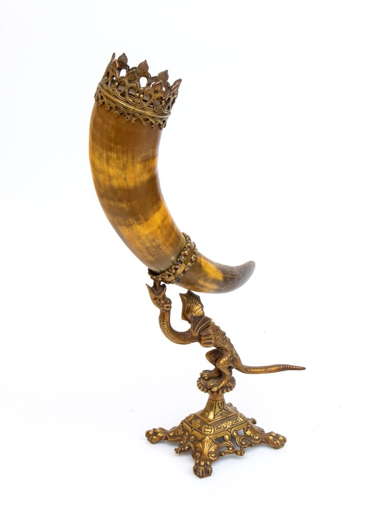 modellata con un drago alato che sostiene il corno. L’insieme poggia su una base quadrata traforata, sorretta da quattro piedini leonini riccamente decorati. Nella parte superiore del corno, all’estremità più ampia, si trova una raffinata decorazione a traforo in metallo. Destinata a collezioni naturalistiche o come oggetto ornamentale da cabinet.
