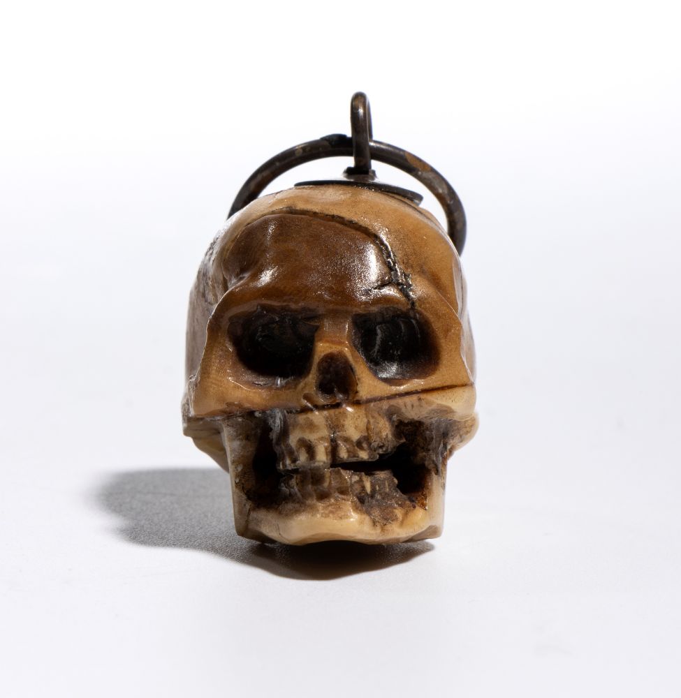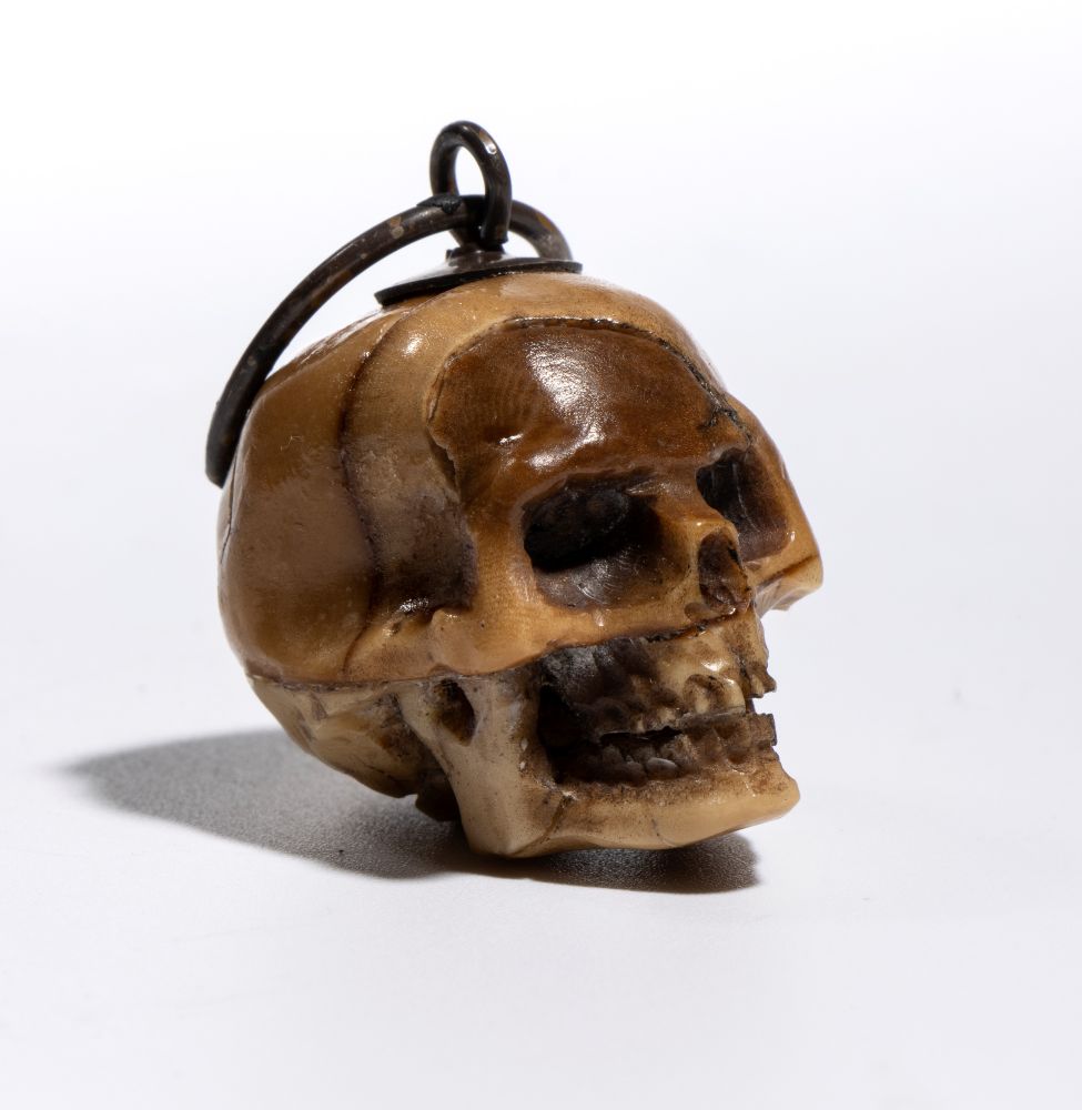 La scultura è accurata e presenta un buon livello di dettaglio. Sulla sommità del teschio è applicato un gancio da cui parte un anello dello stesso materiale, pensato per permettere l’uso come pendente o amuleto. È anche possibile interpretare questo pendente come un memento mori, cioè un oggetto simbolico che invita alla consapevolezza della mortalità umana. I memento mori erano diffusi già nel Medioevo e nel Rinascimento e venivano utilizzati per ricordare la caducità della vita, spronando a vivere con saggezza, virtù o spiritualità. Il simbolo del teschio era tra i più comuni: rappresentava la transitorietà dell’esistenza e il valore del tempo. Anche oggi, in contesti artistici o personali, un teschio indossato come gioiello può mantenere questo significato meditativo, oltre a quello estetico.