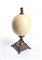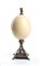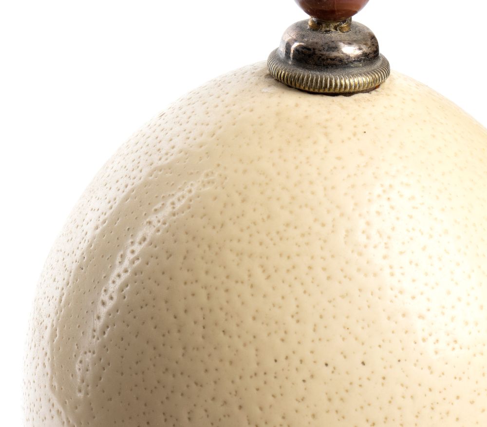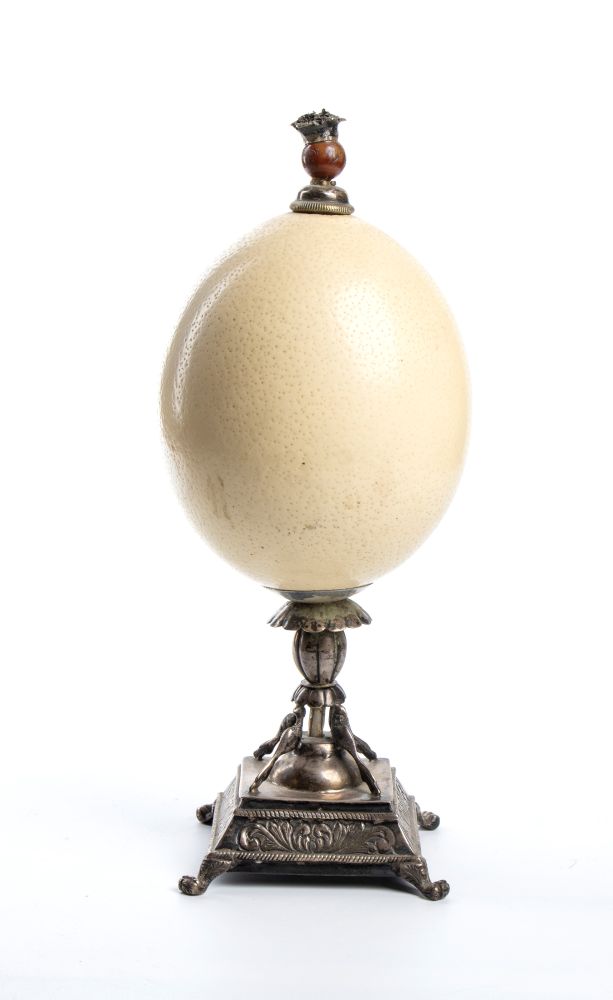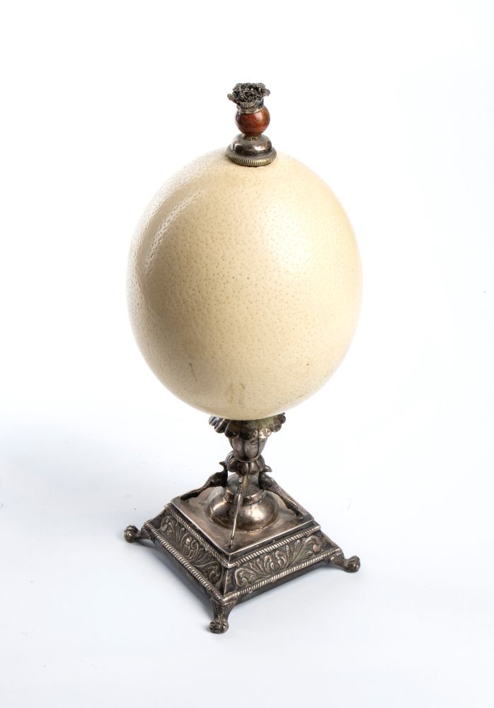 montato su base quadrata in argento, finemente decorata con motivi a volute fogliate e sorretta da quattro piedini leonini. Sulla base si ergono quattro uccelli modellati, a loro volta portanti un elemento ovale che sostiene l’uovo. La sommità dell’uovo è coronata da un elemento decorativo in argento, al centro del quale è inserita una pietra dura naturale. Esemplare tipico della produzione destinata a collezioni e cabinets of curiosities.