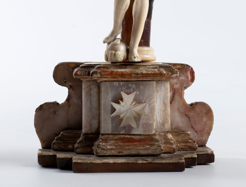 La figura poggia su una base architettonica lignea a tempietto dipinta in policromia, arricchita da inserti di madreperla e da una croce a otto punte, probabilmente simbolo dell’Ordine di Malta, forse un riferimento devozionale o araldico.