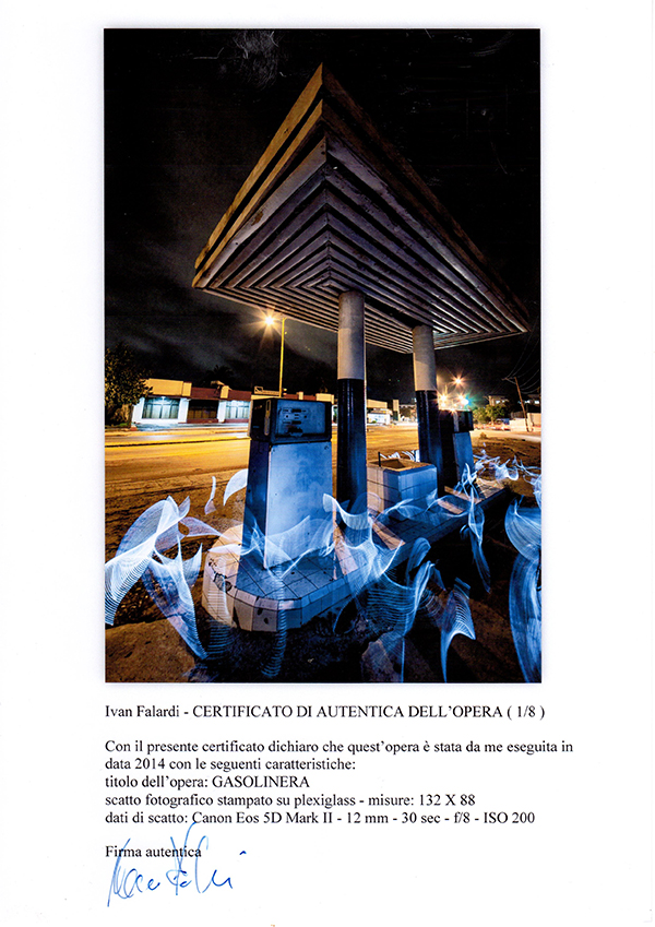 IVAN FALARDI "gasolinera" ,2014, scatto fotografico stampato su plexiglass cm 132x88. Opera con autentica