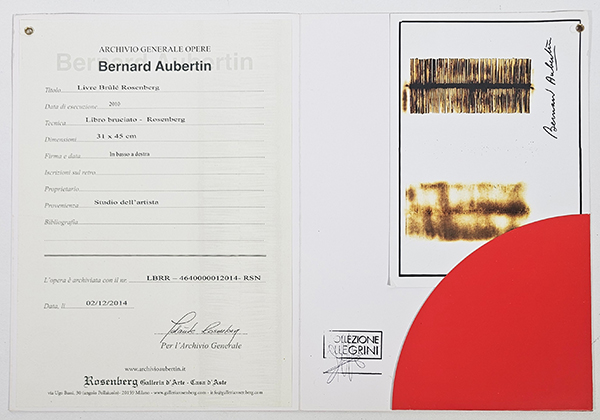 Bernard Aubertin, "Livre Brûlé Rosenberg" Fiammiferi bruciati su catalogo, Cm 31 x 45,. Firmato in basso a destra. Opera registrata presso l'Archivio Opere Bernard Aubertin al numero LBRR - 4640000012014 - RSN. Certificato di archiviazione su fotografia. Opera NON incorniciata in condizioni originali