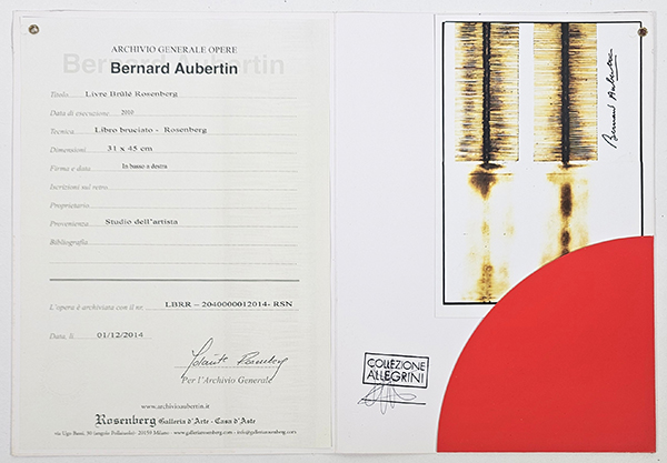 Bernard Aubertin, "Livre Brûlé Rosenberg" Fiammiferi bruciati su catalogo, Cm 31 x 45,. Firmato in basso a destra. Opera registrata presso l'Archivio Opere Bernard Aubertin al numero LBRR - 4640000012014 - RSN. Certificato di archiviazione su fotografia. Opera NON incorniciata in condizioni originali