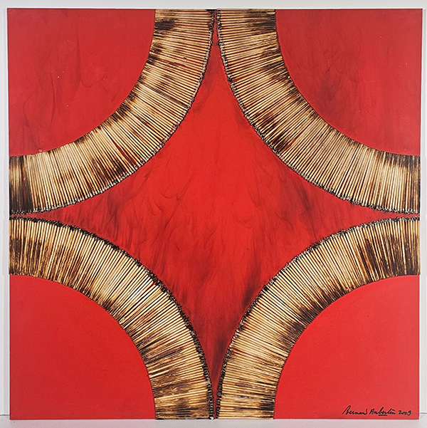 Bernard Aubertin, "Dessin de Feu sur Table Rouge" Acrilico e fiammiferi bruciati su tavola, Cm 70x70 Anno 2009 Firma e anno in basso a destra. Opera registrata presso Archivio Generale opere Bernard Aubertin al numero DFT - 30300000902015 - RSN.Certificato di autenticità e archiviazione su fotografia.. L'opera è stata esposta in occasione della mostra "Bernard Aubertin - Feu sur Bois" tenutasi presso la Galleria Rosenberg di Milano con la presenza dell'artista. Opera pubblicata nel catalogo "Feu sur Bois" a pagina 134, che verrà consegnato unitamente all'opera. Provenienza Galleria Rosenberg Milano. Timbro "Collezione Allegrini" sul certificato di archiviazione e autenticità. Opera in buone condizioni NON incorniciata