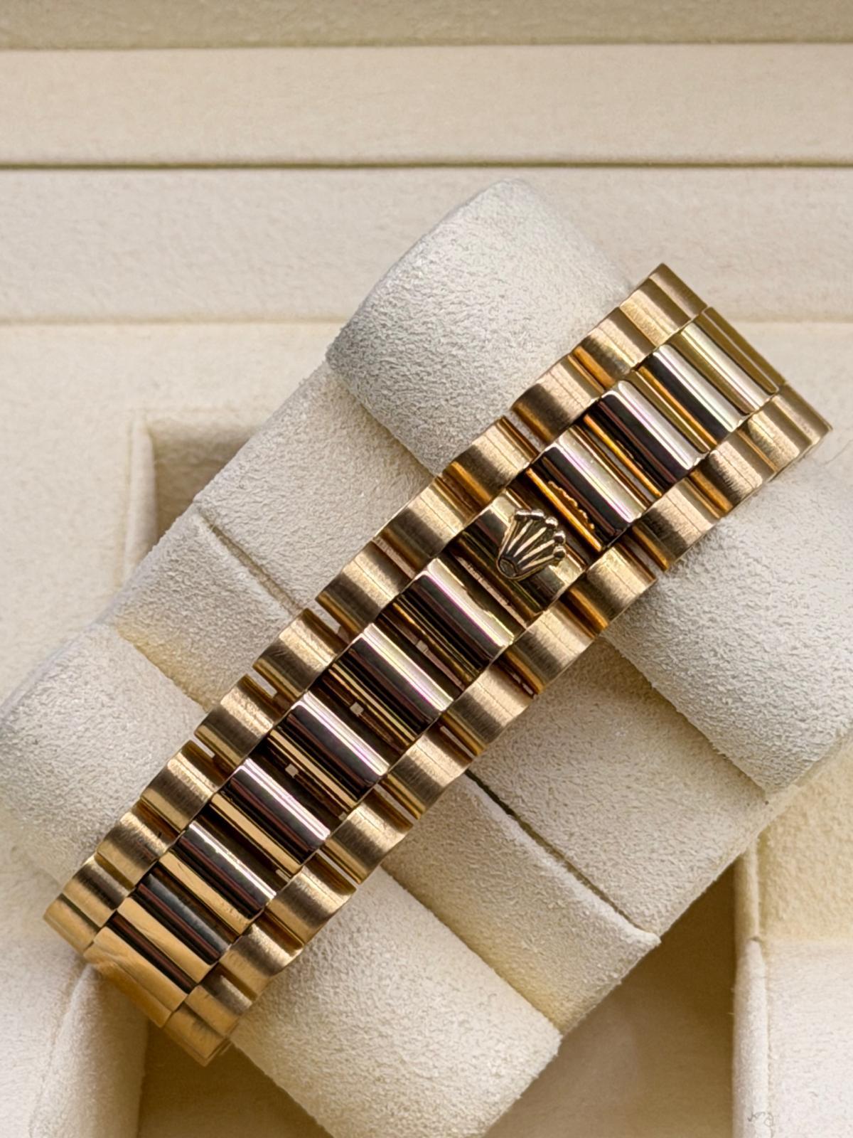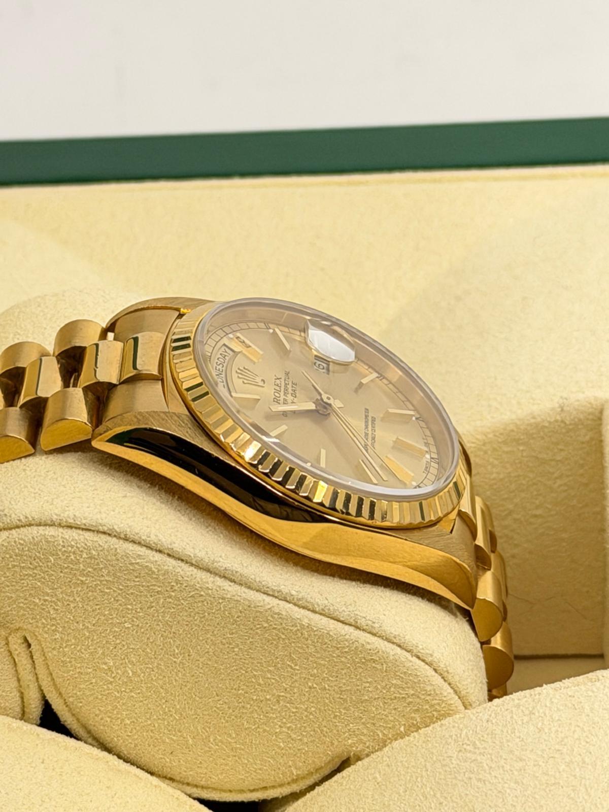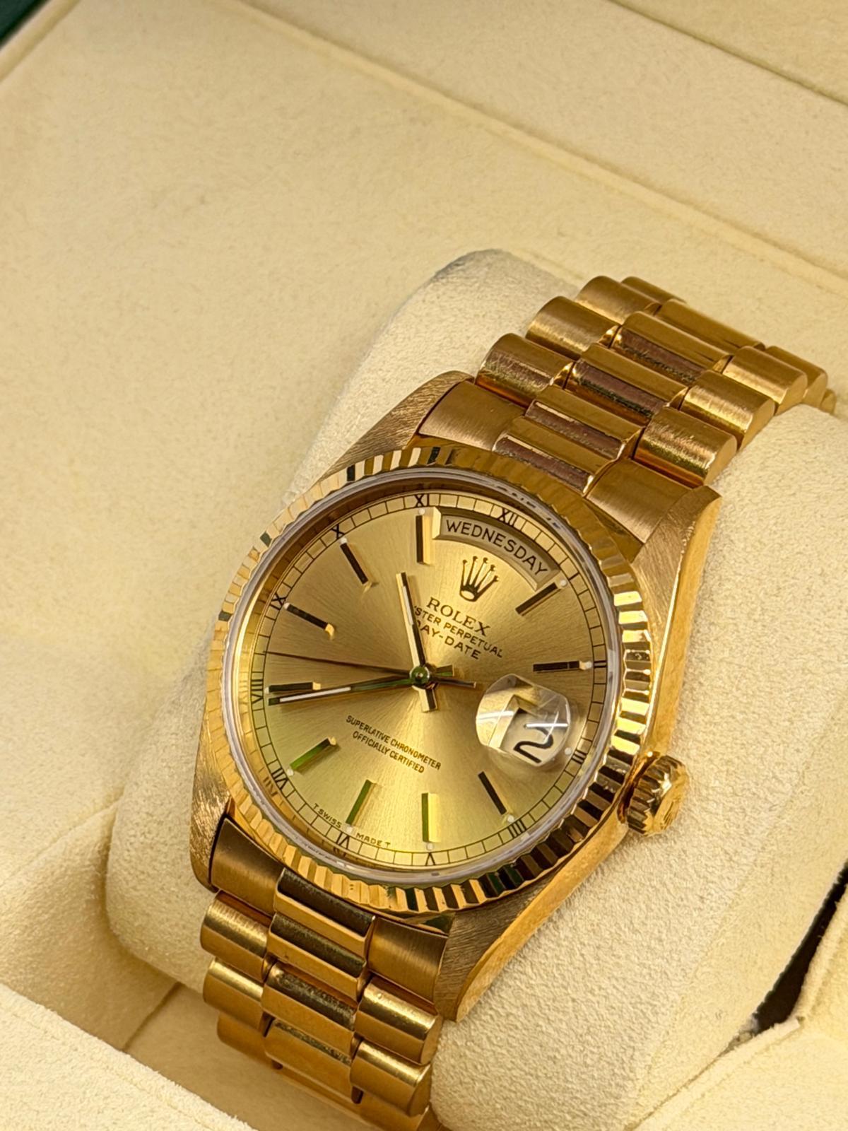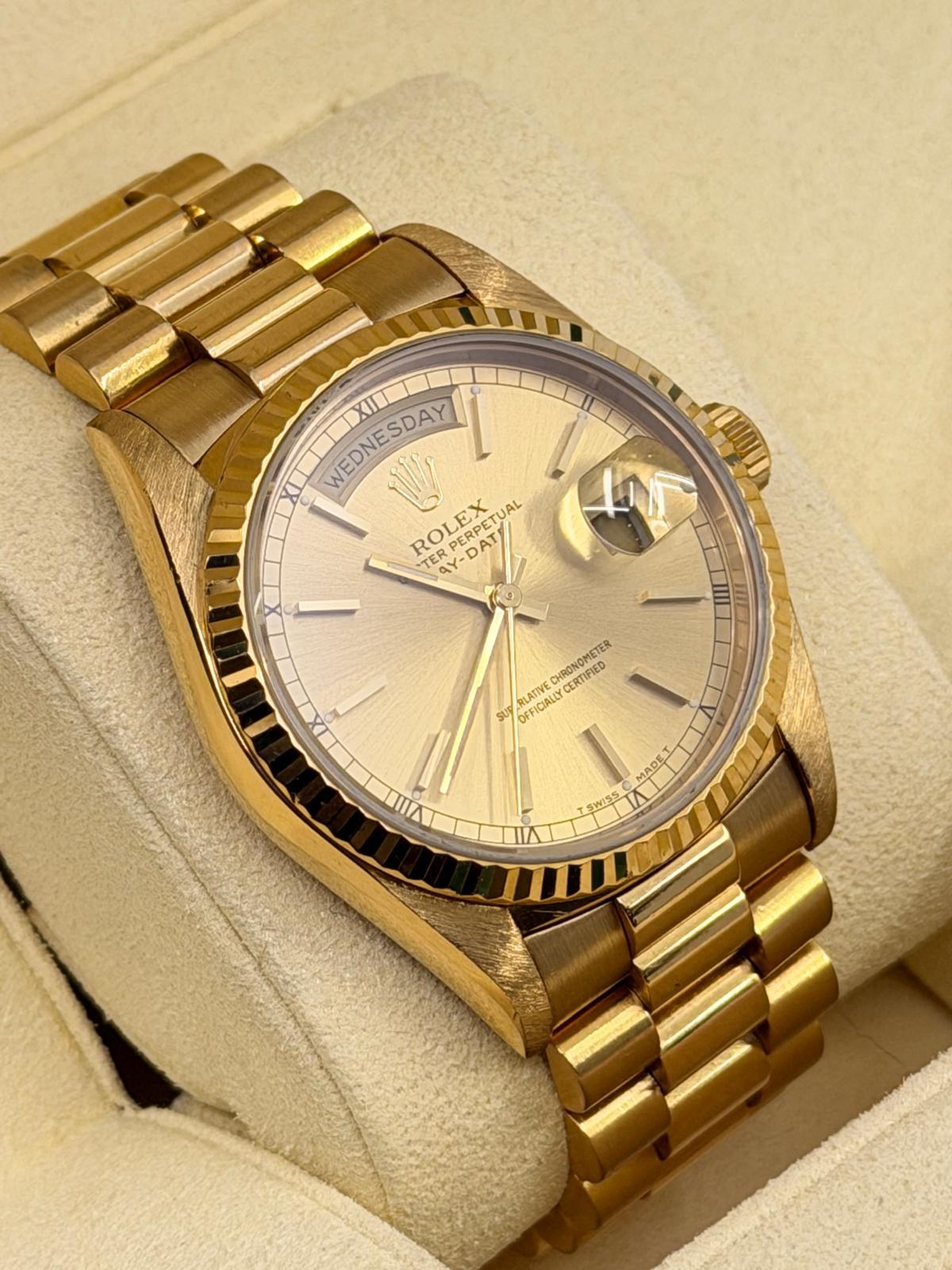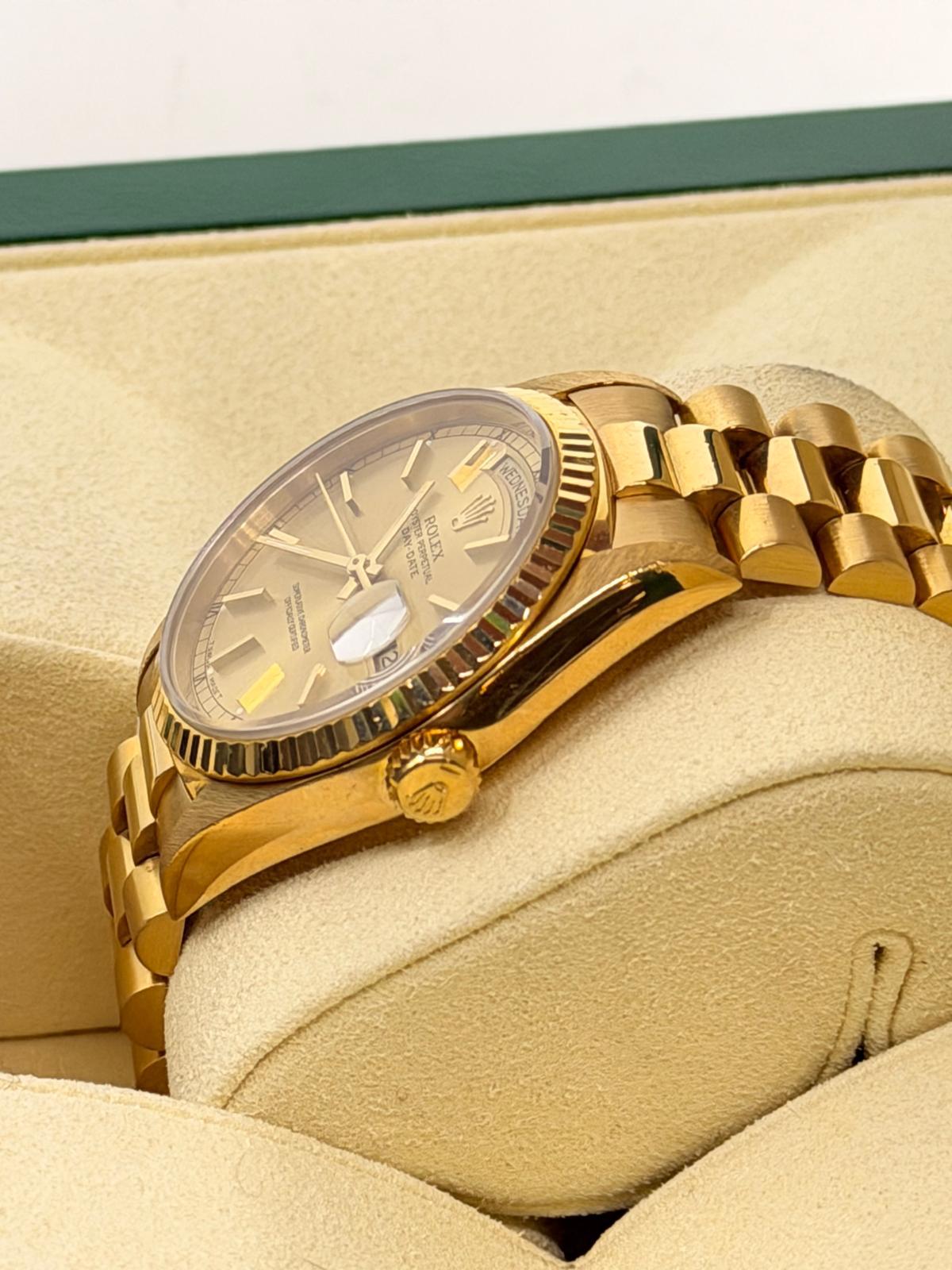 Marca Rolex Modello (Orologio) Day-Date 36 Numero di referenza 18238 Carica Automatico Materiale della cassa Oro giallo Materiale cinturino Oro giallo Anno di produzione 1989 Condizione Ottimo (di seconda mano, segni di usura assenti o appena visibili) Corredo documenti originali, no box Carica Automatico Materiale della cassa Oro giallo Diametro 36 mm Impermeabile 10 ATM Materiale lunetta Oro giallo Vetro Vetro zaffiro Cinturino Materiale cinturino Oro giallo Colore cinturino Oro Materiale chiusura Oro giallo - COMMISSIONE D’ASTA 25%