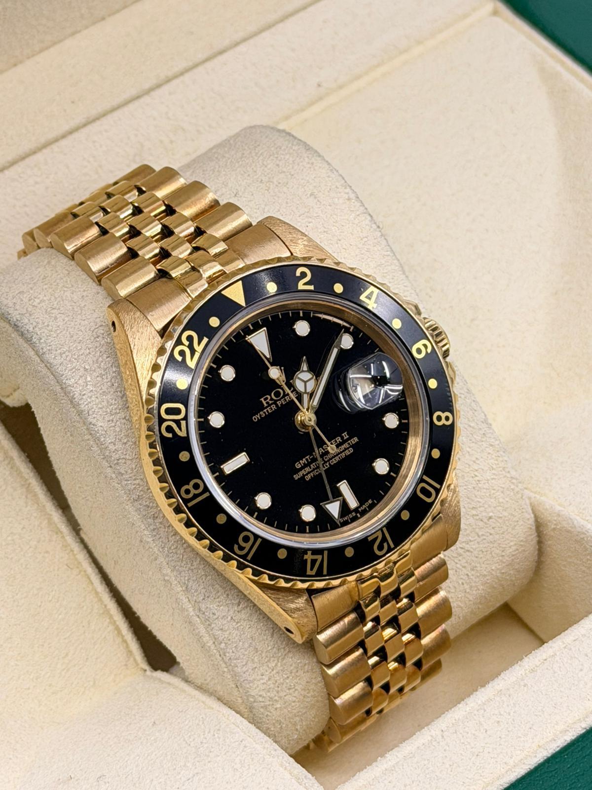 Marca Rolex Modello (Orologio) GMT-Master II Numero di referenza 16718 Carica Automatico Materiale della cassa Oro giallo Materiale cinturino Oro giallo Condizione Usato (Ottimo) L'articolo presenta segni di usura lievi, come ad esempio graffi leggeri, ma non percepibili al tatto. Corredo Senza scatola originale né documenti originali Carica Automatico Cassa Materiale della cassa Oro giallo Diametro 40 mm Materiale lunetta Alluminio Vetro Vetro zaffiro Cinturino in oro 18ct aftermarket - COMMISSIONE D’ASTA 25%