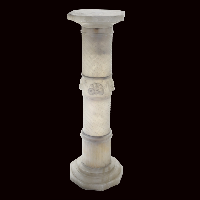 Colonna in alabastro con fusto scanalato a spirale e decorazione con ghirlande e festoni di fiori. Parte inferiore scanalata poggiante su basamento ottagonale.