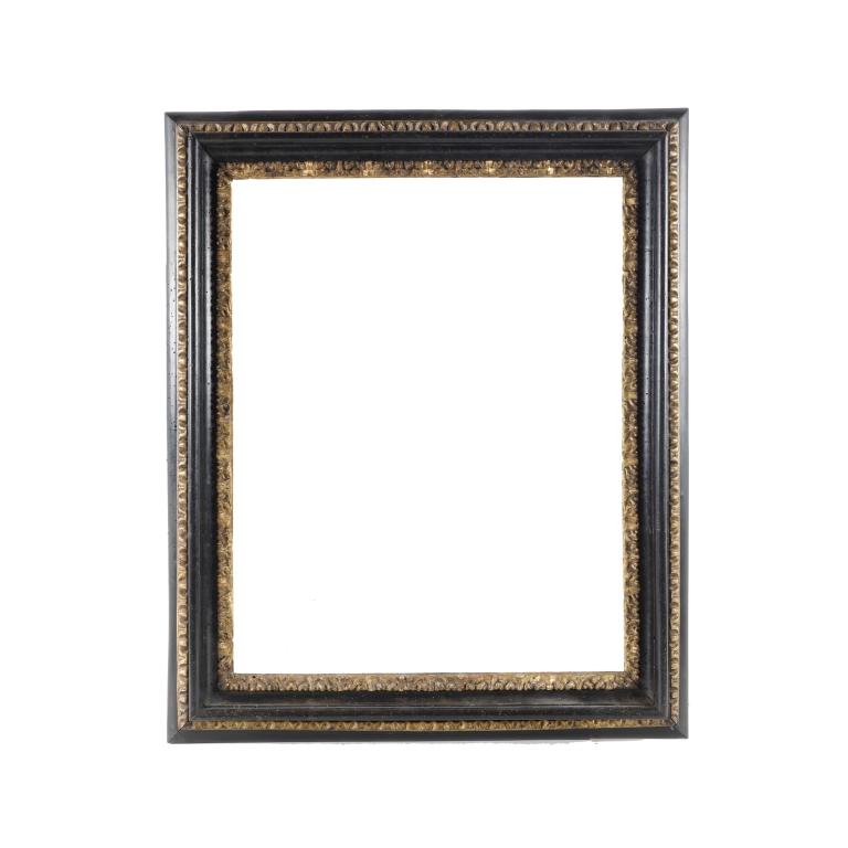 Cornice in legno di pioppo lacca nera a due ordini di intaglio dorati