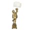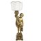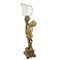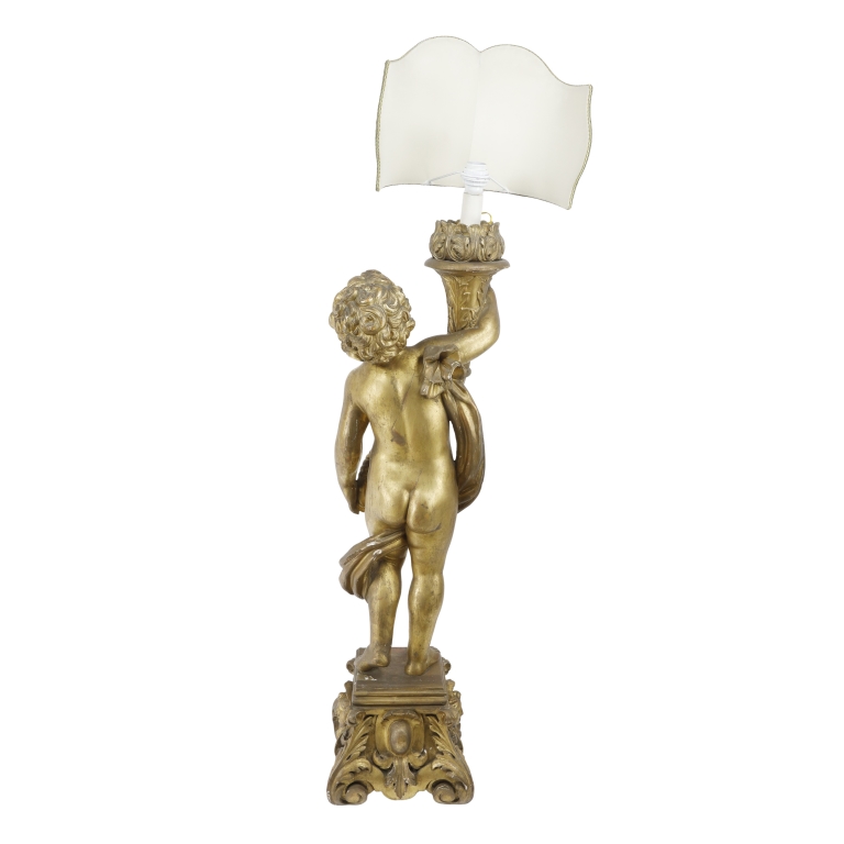 Importante scultura lignea dorata a foglia oro raffigurante putto con cornucopia fungente da lampada, su basamento riccamente intagliato a volute e 4 mascheroni centrali. Provenienza Piemonte