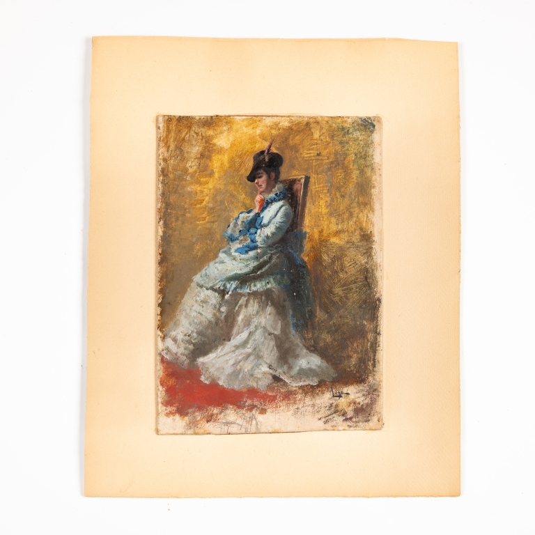 Ritratto di "Ragazza seduta con cappello", olio su cartone firmato in basso a destra "Lega"