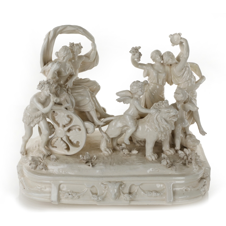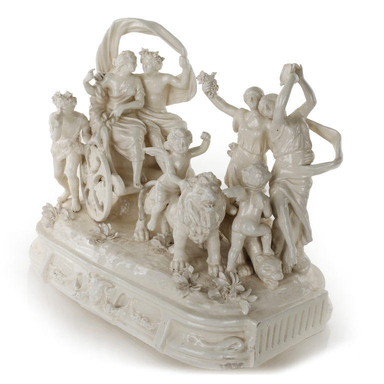 Gruppo in porcellana bianca raffigurante "Baccanale" in carro allegoria