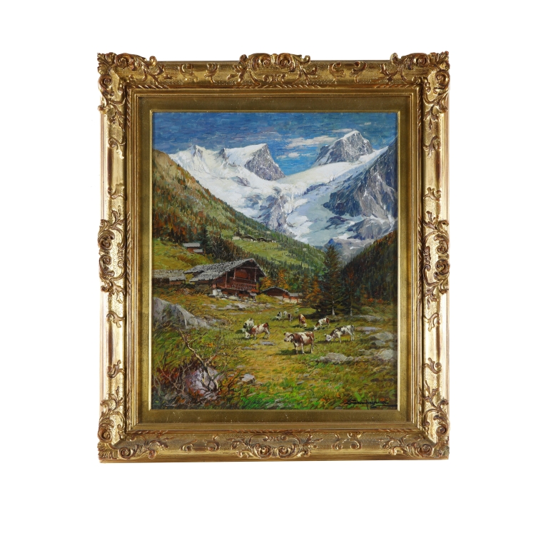 Olio su Tela Dipinto olio su tela raffigurante paesaggio alpino con pascolo di buoi, baite e sullo sfondo il Monte Rosa (Valle D'Aosta).